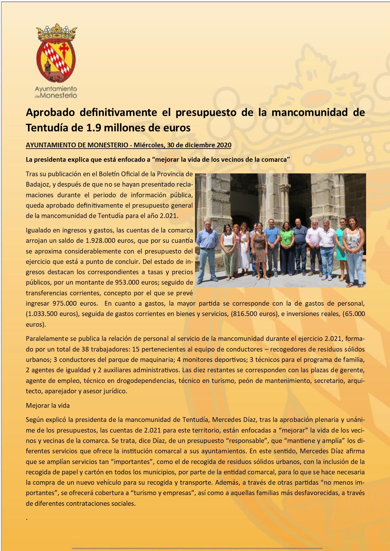 Aprobado definitivamente el presupuesto de la mancomunidad de Tentudía de 1.9 millones de euros