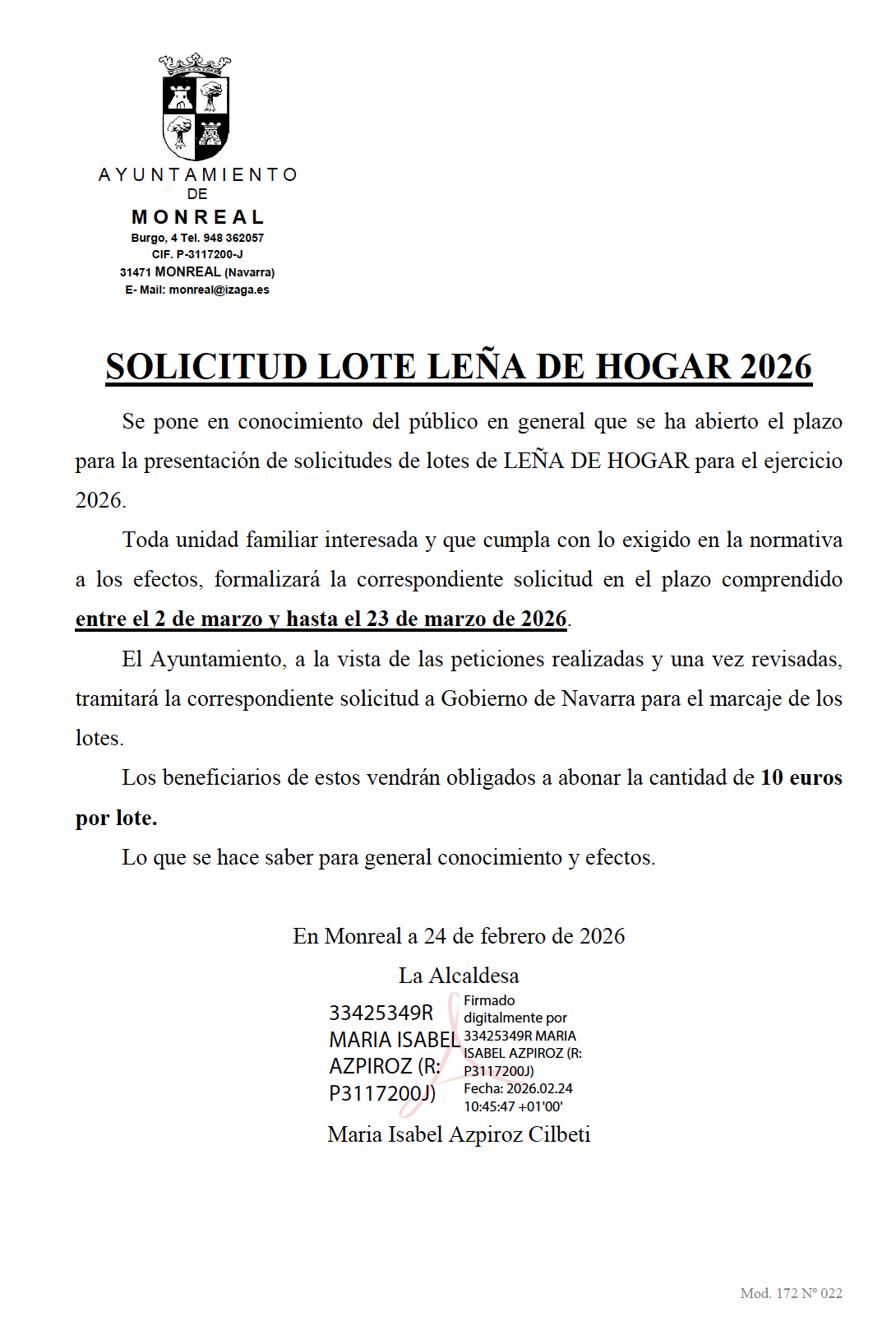 Se pone en conocimiento del público en general, que seva a proceder a abrir el plazo para la presentación de solicitudes de lotes de LEÑA DE HOGAR para el ejercicio 2026.