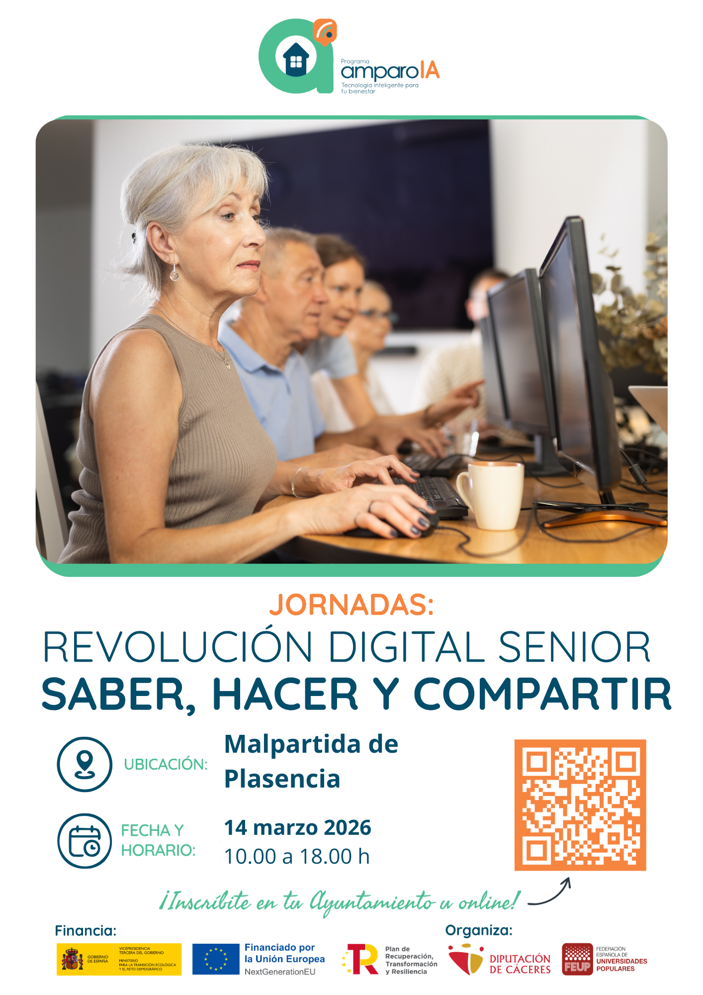 Se comunica al vecindario la realización de una excursión a Malpartida de Plasencia en el marco del proyecto IAMPARO, dirigida a personas mayores de 60 años. La actividad forma parte de las jornadas "Revolución Digital Senior: Saber, Hacer y Compartir".