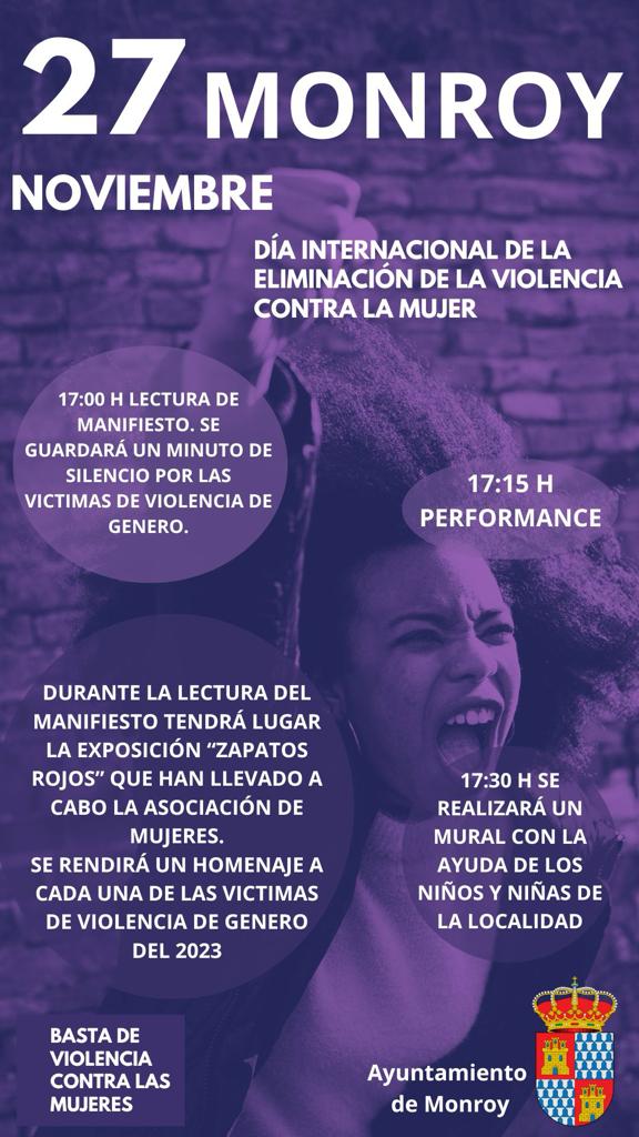 DÍA INTERNACIONAL DE LA ELIMINACIÓN DE LA VIOLENCIA CONTRA LA MUJER2023-11-24 13:42:23Info GeneralSe adjunta cartel informativo de las actividades programadas para el próximo lunes 27 de noviembre, Día Internacional de la Eliminación de la Violencia Contra la Mujer, para todas las personas que deseen asistir.