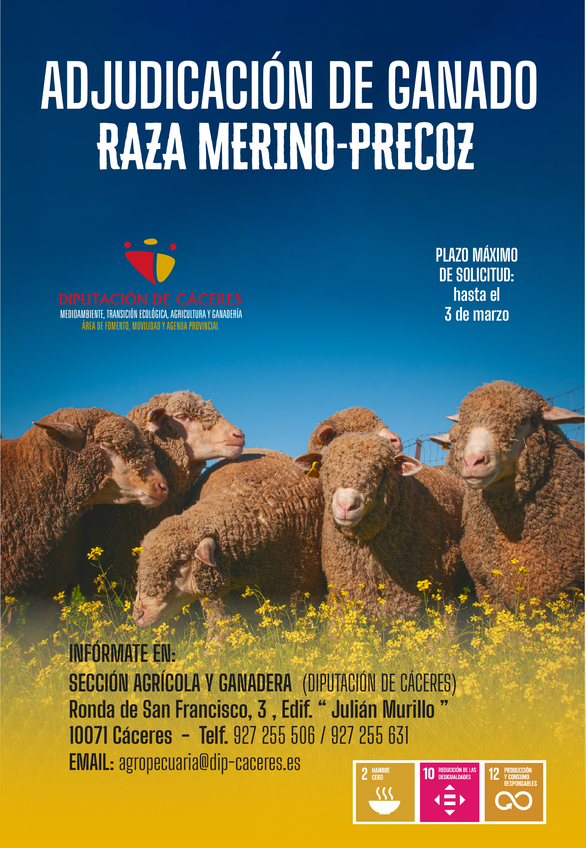 VENTA GANADO OVINO MERINO PRECOZ PARA VIDA2025-02-07 13:26:49Info GeneralSe informa a aquellas personas interesadas en solicitar la adjudicación de ganado ovino de la raza Merino Precoz, procedente de la finca "El Cuartillo" de Cáceres, que deben presentar sus solicitudes hasta las 14:00 h. del día 3 de marzo de 2025.