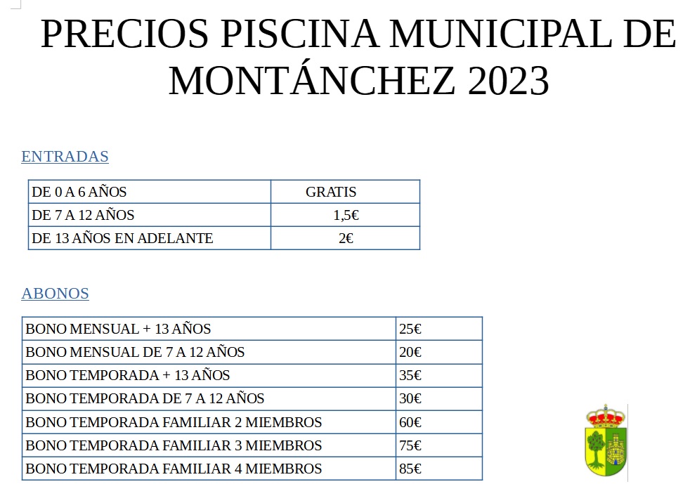 Precios piscina municipal 20232023-06-05 12:12:15Info GeneralLos usuarios de la piscina municipal de Montánchez se beneficiarán de una bajada significativa de los precios de los abonos para la temporada 2023.