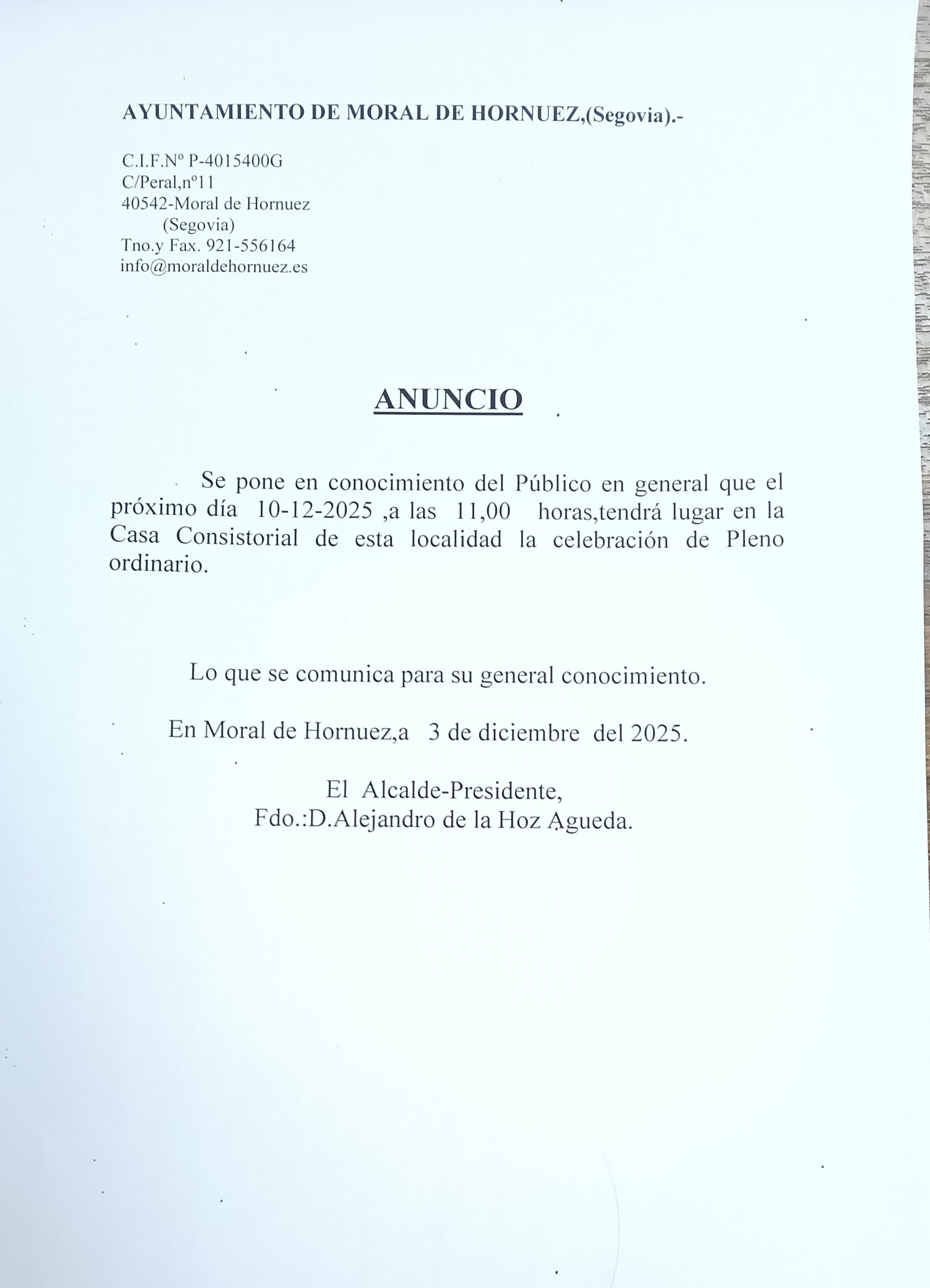 El próximo 15 de abril de 2026 a las 11'00 horas, tendrá lugar en la casa consistorial de esta localidad la celebración de un Pleno Ordinario.