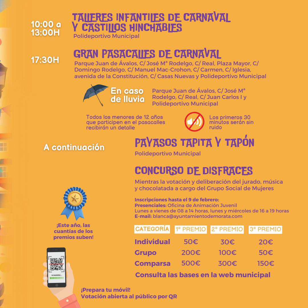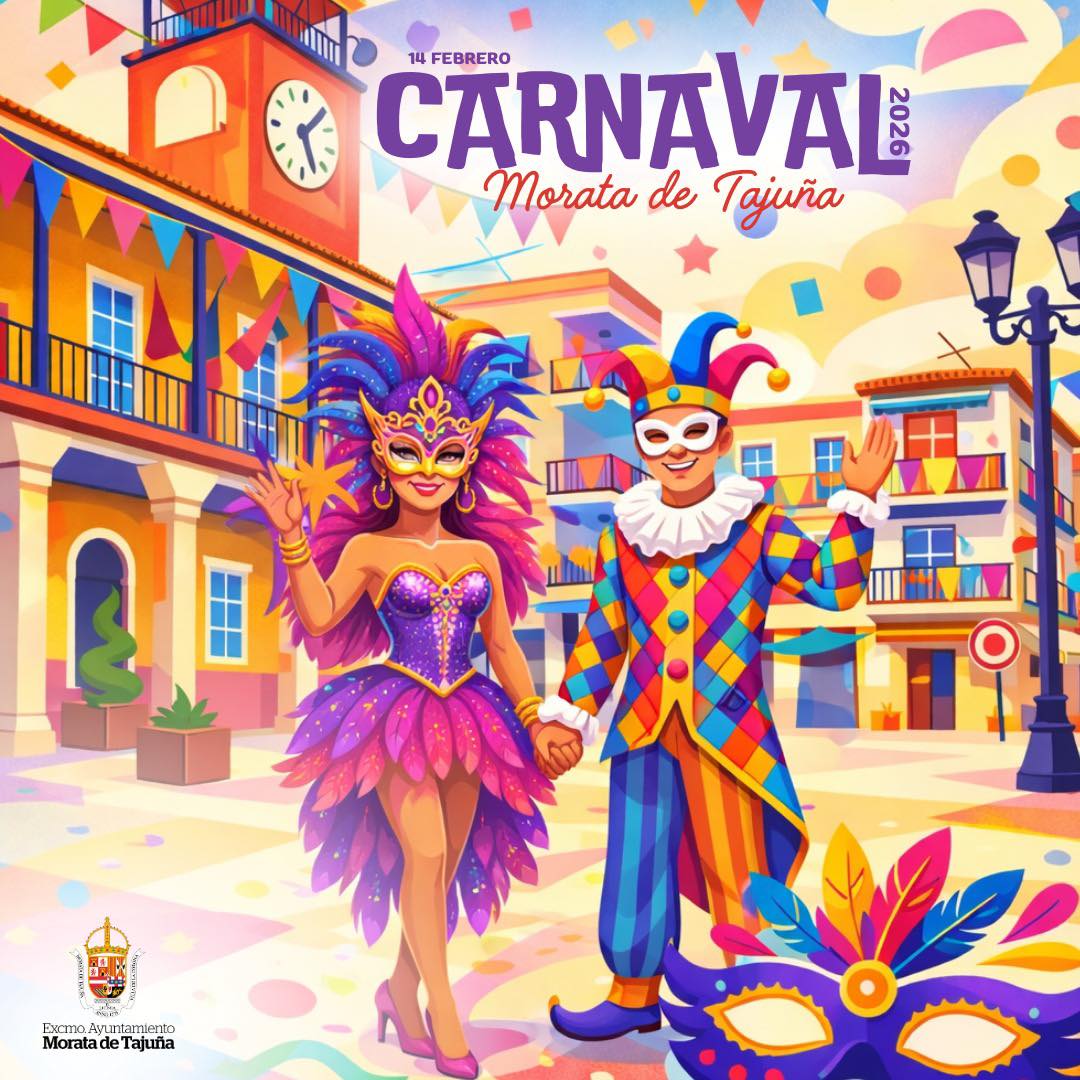 ¡Prepara ya tu disfraz, porque llega el Carnaval a Morata! Lo hará el próximo 14 de febrero, en una jornada que comenzará desde por la mañana en el Polideportivo Municipal con talleres y castillos hinchables para los más pequeños como antesala al gran desfile de la tarde ¡Además, no te pierdas la fiesta que los payasos Tapita y Tapón han organizado a continuación!