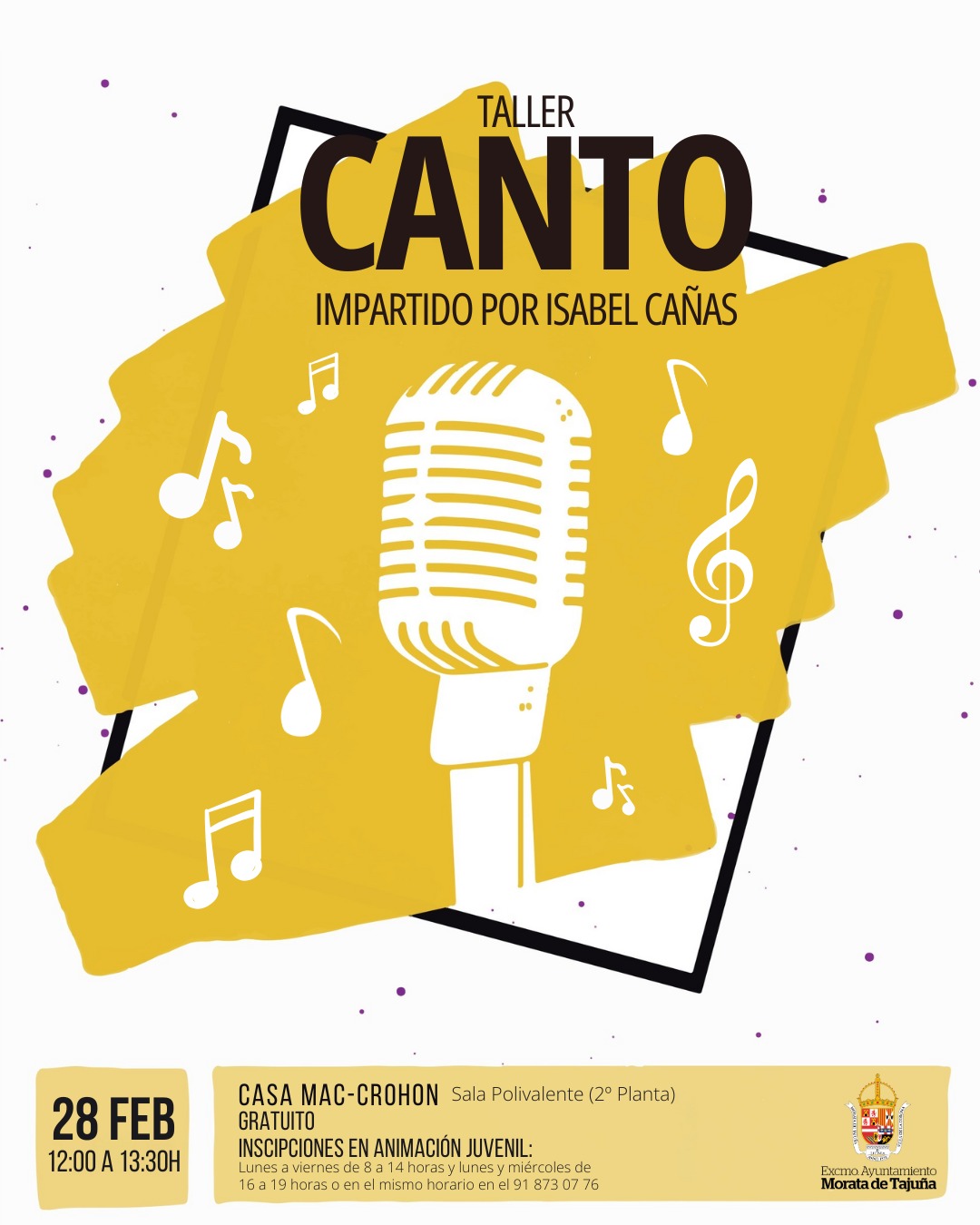 Si te gusta cantar o quieres mejorar tu técnica, no te pierdas el Taller de Canto que tendrá lugar el sábado 28 de febrero en la Casa Mac-Crohon. Impartido por Isabel Cañas, esta masterclass, se desarrollará de 12:00 a 13:30 horas en la Sala Polivalente y está dirigida a mayores de 12 años.