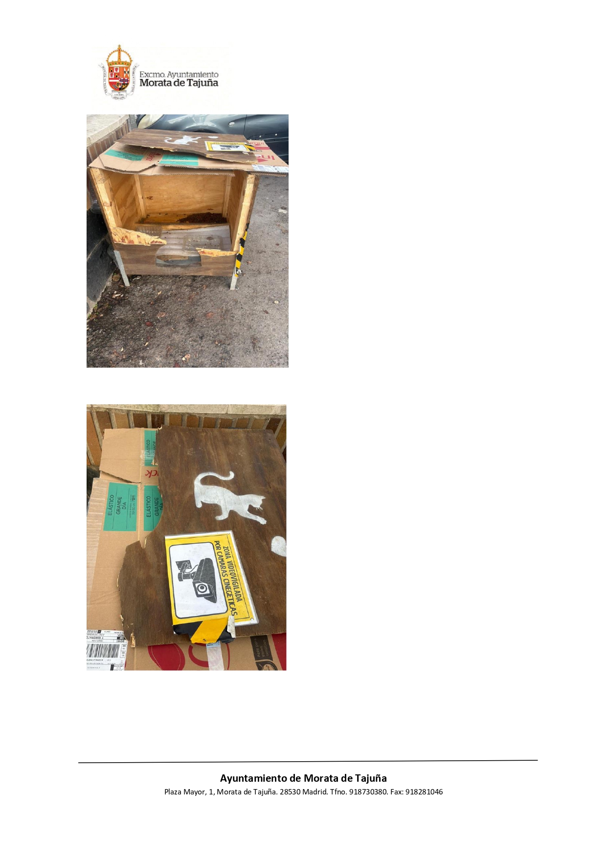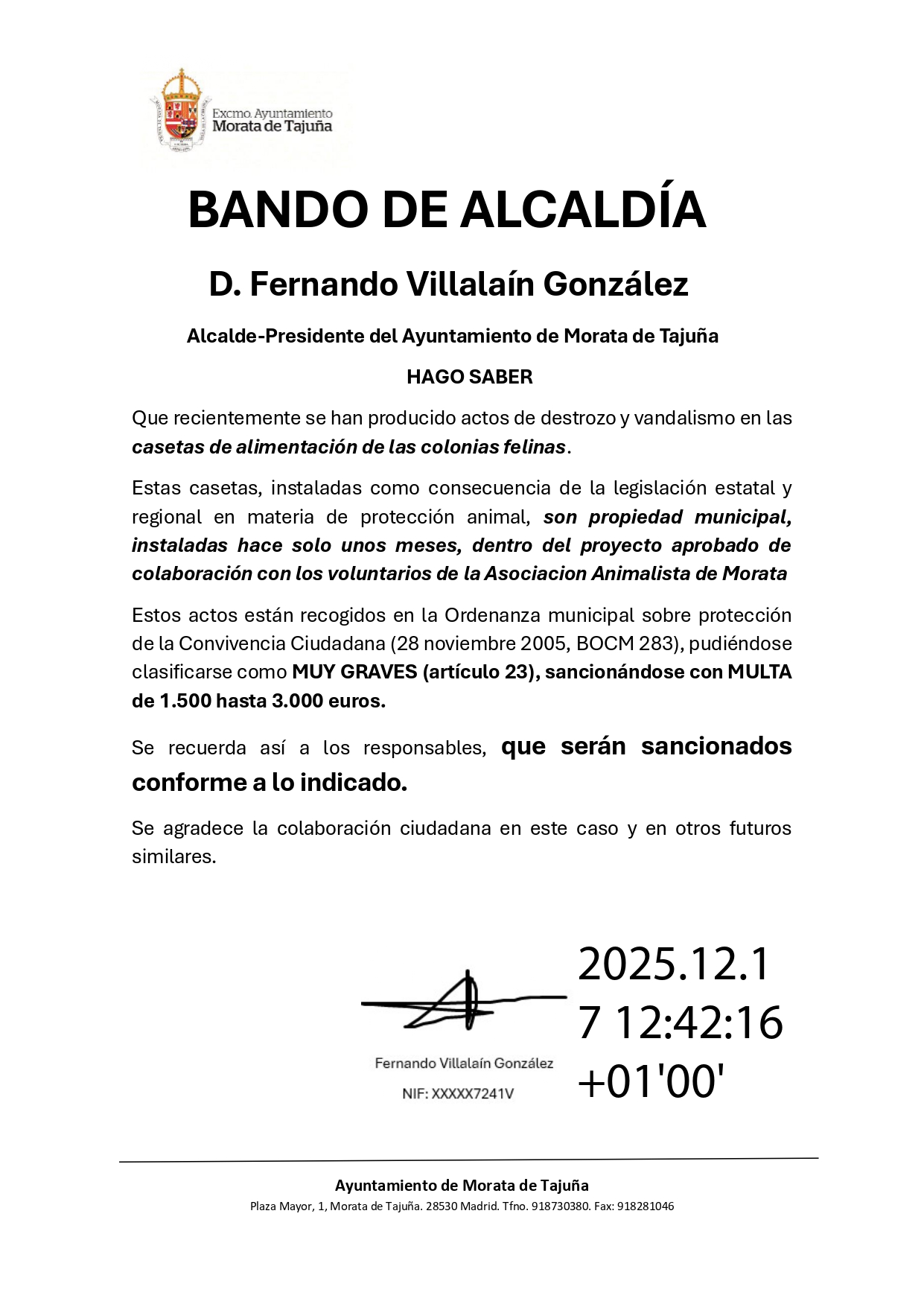El alcalde de Morata de Tajuña, Fernando Villalaín González, ha emitido un bando informando de los recientes actos de vandalismo y destrozos en las casetas de alimentación de las colonias felinas, recordando que estas instalaciones son propiedad municipal y que este tipo de conductas están consideradas como infracciones muy graves, pudiendo conllevar sanciones económicas de entre 1.500 y 3.000 euros.