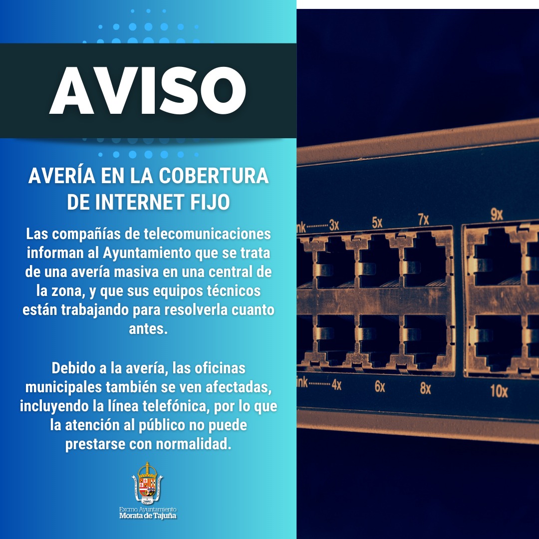 Debido a una avería masiva en una central de la zona, se están registrando problemas de cobertura de internet y conexión wifi en todo el municipio. Desde el Ayuntamiento ya se ha contactado con las principales empresas distribuidoras que informan que sus equipos técnicos están trabajando para resolverla cuanto antes, posiblemente en el día de hoy.
