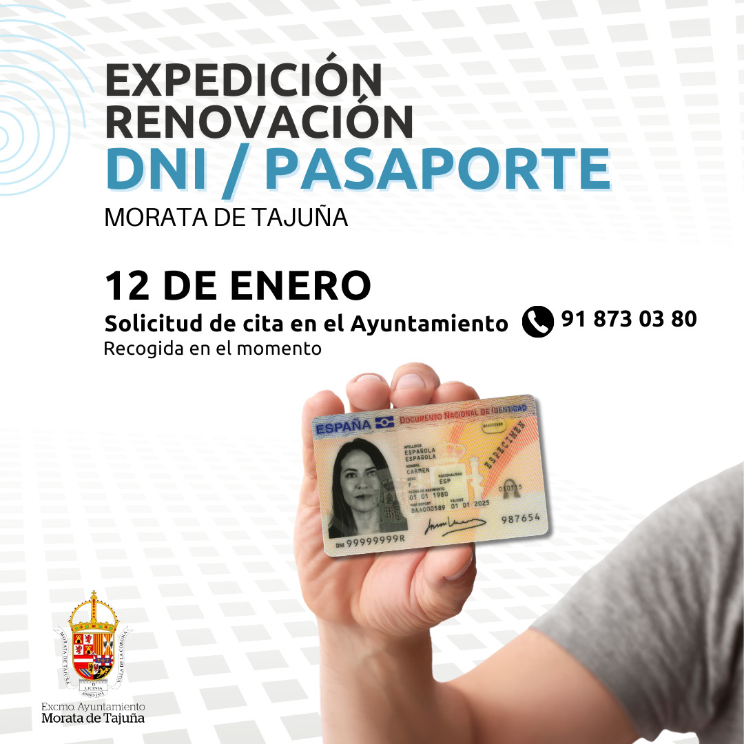 ¿Necesitas renovar o expedir por primera vez el DNI o Pasaporte? Ahora puedes hacerlo sin salir de Morata. El próximo 12 de enero, de 9:00 a 14:00 horas, un equipo móvil estará en la plaza Mayor, junto al Ayuntamiento.