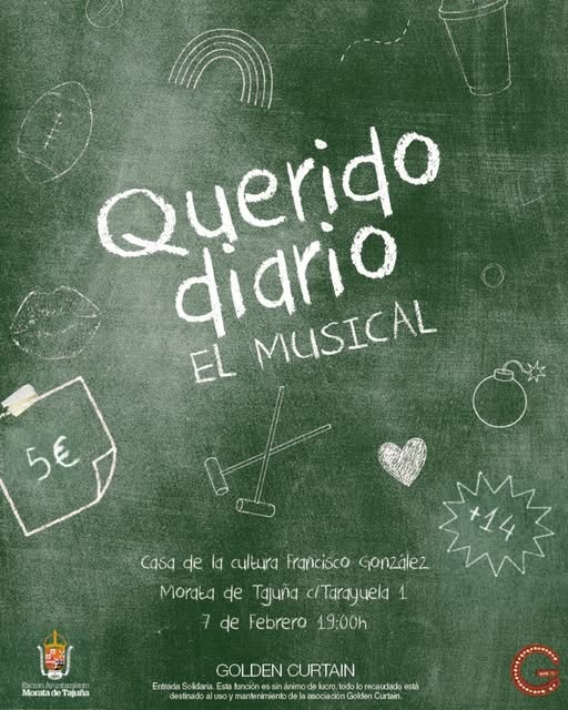 🎭🎶 ¡Este sábado, tienes plan en Morata! 'Querido diario – el musical' llega a la Casa de la Cultura ‘Francisco González’ de la mano del grupo Golden Curtain para demostrar que el teatro juvenil puede ser atrevido, divertido y muy actual. Una historia llena de emociones, giros inesperados y canciones que te atraparán desde el primer minuto en una comedia negra que no dejará indiferente a nadie ¡Déjate sorprender y no te lo pierdas!