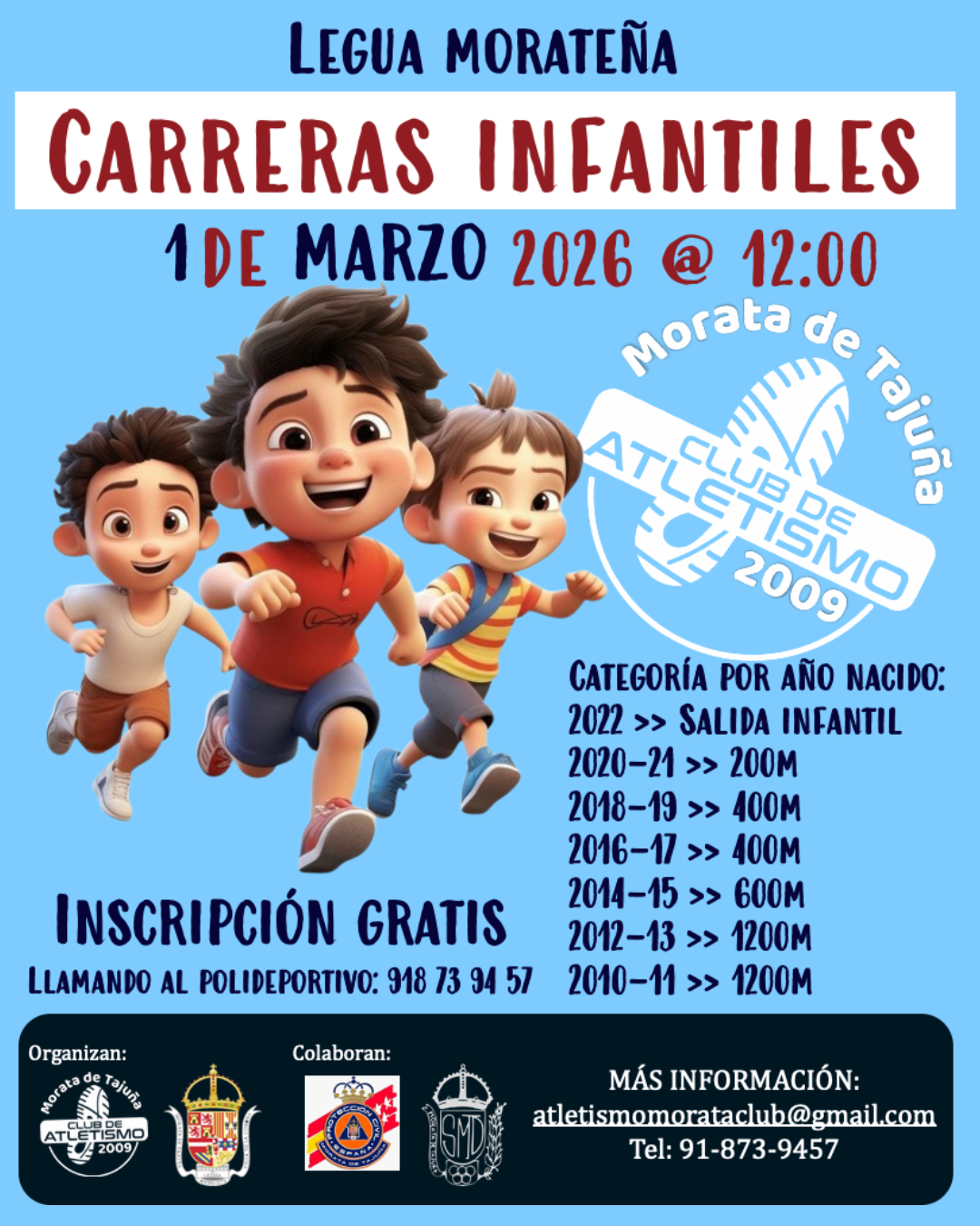 Los más pequeños también tendrán su espacio en la V edición de la Legua Morateña. Al mediodía, podrán competir hasta en 7 categorías diferentes según su edad ¡Y sólo por participar se llevarán una bolsa del corredor y una camiseta!