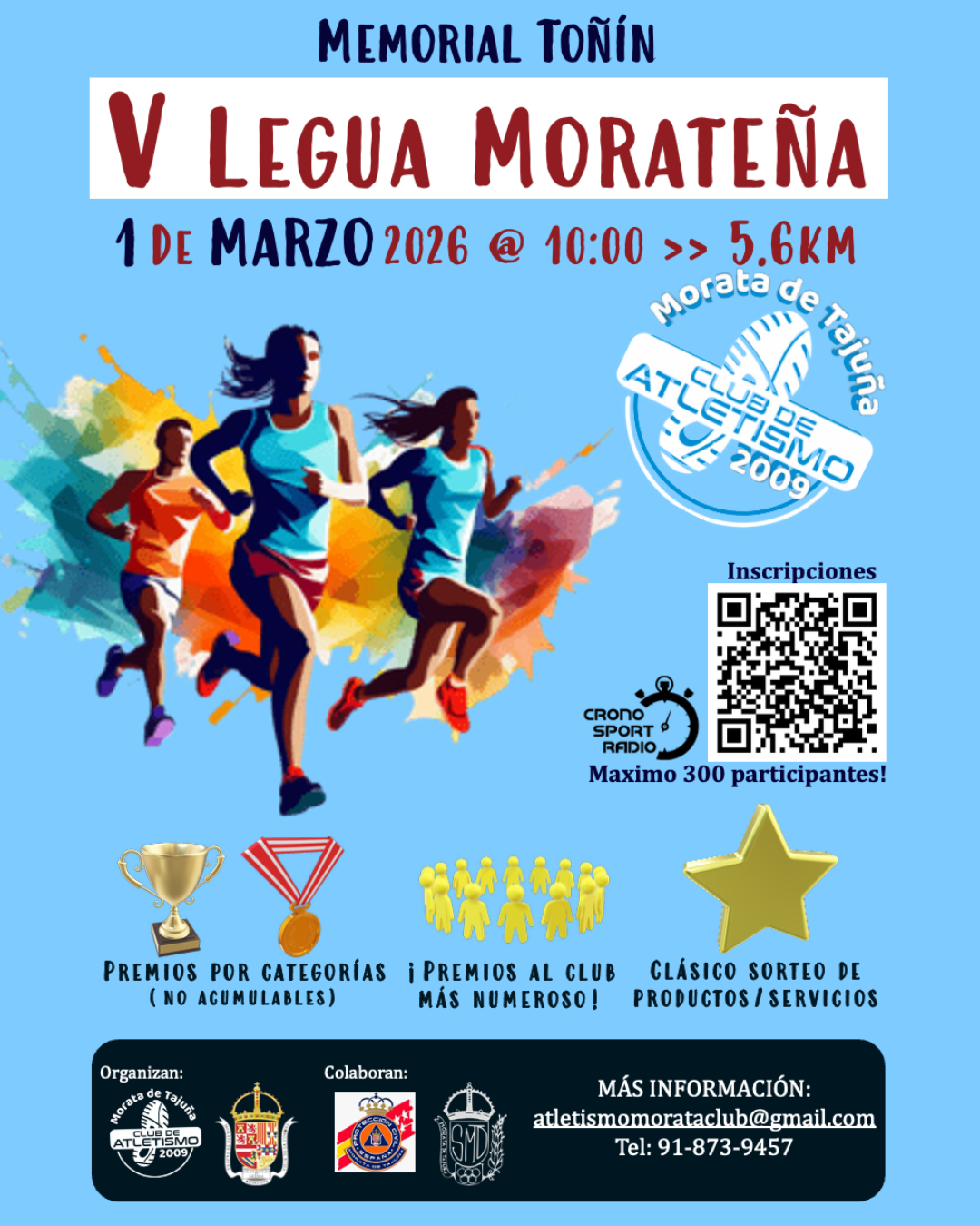 ¡Vuelve la V Legua Morateña - Memorial Toñín! Prepárate a correr porque, el próximo 1 de marzo, regresan las carreras por Morata por un trazado de 5,6 kilómetros con salida y meta en la plaza Mayor en un evento organizado por el Club de Atletismo Morata ¡Con premios por categorías y muchos sorteos! ¡No te quedes sin tu dorsal!