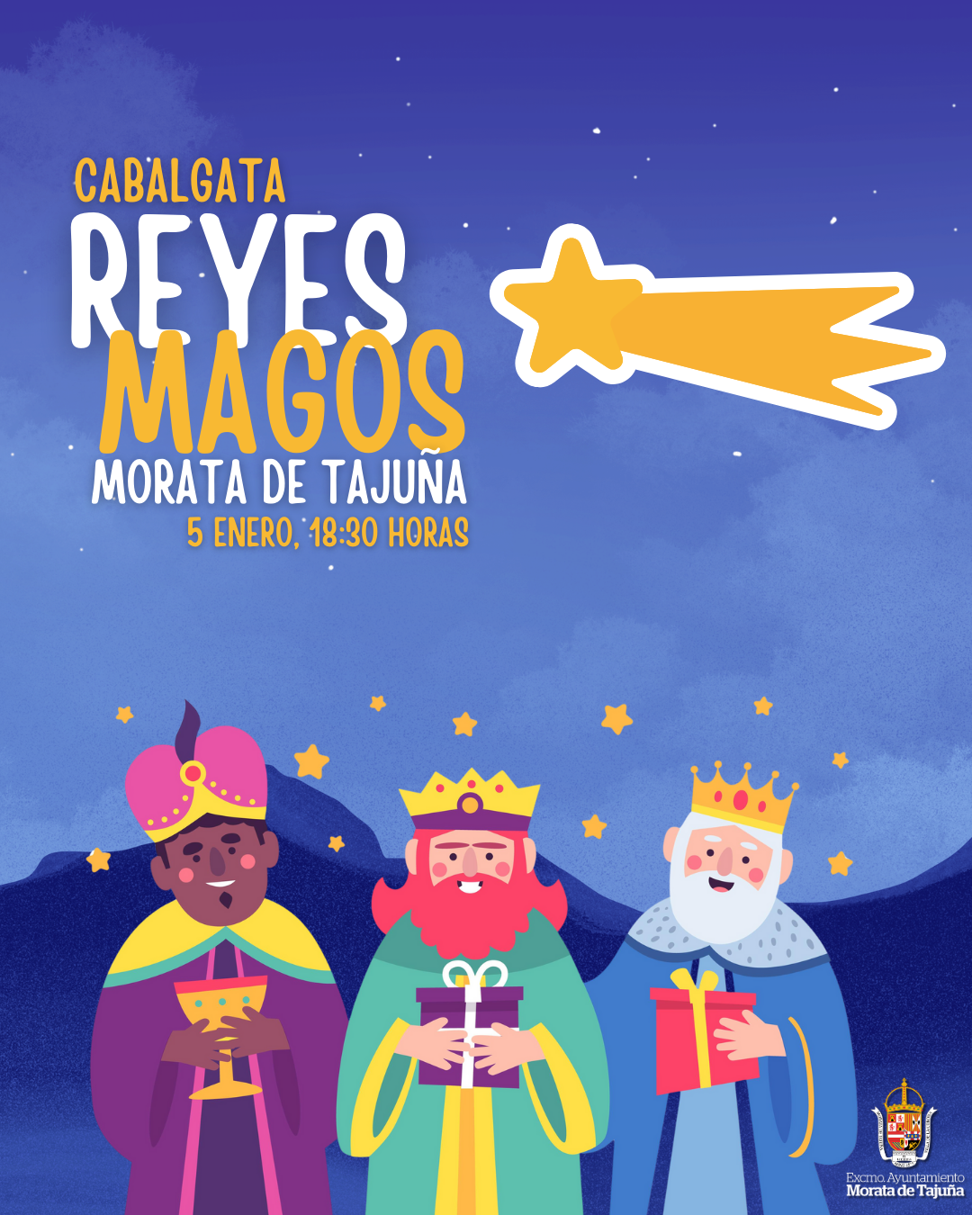 Sus Majestades los Reyes Magos de Oriente no faltarán a su cita con los niños de Morata de Tajuña en la tarde más mágica del año. Será el próximo 5 de enero, cuando a las 18:30 horas, su comitiva parta desde El Bosque llegando hasta la plaza Mayor, desde donde saludarán a todo el pueblo para finalizar su camino en la iglesia parroquial antes de comenzar con el reparto de regalos.