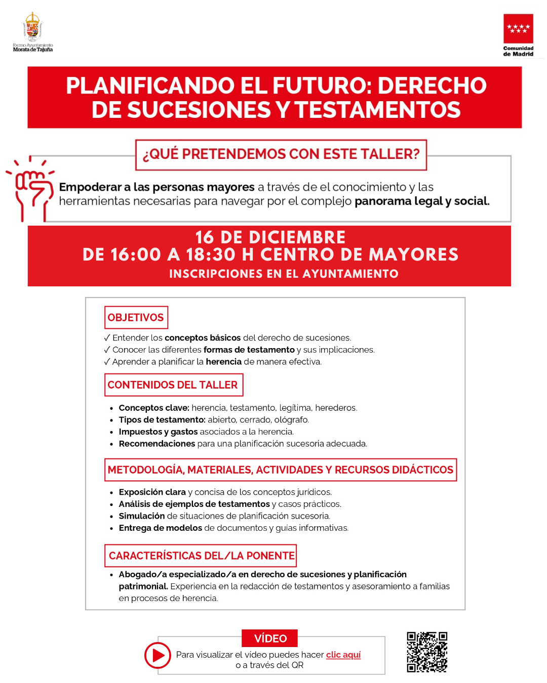 ¿Eres mayor y te gustaría dejar tu herencia bien organizada? La Comunidad de Madrid organiza, el 16 de diciembre, una sesión informativa en la que podrás conocer los conceptos básicos del derecho de sucesiones, las distintas formas de testamento y recomendaciones útiles para planificar tu futuro legal de forma clara y sencilla.- Centro de Mayores (Casa Mac-Crohon)
