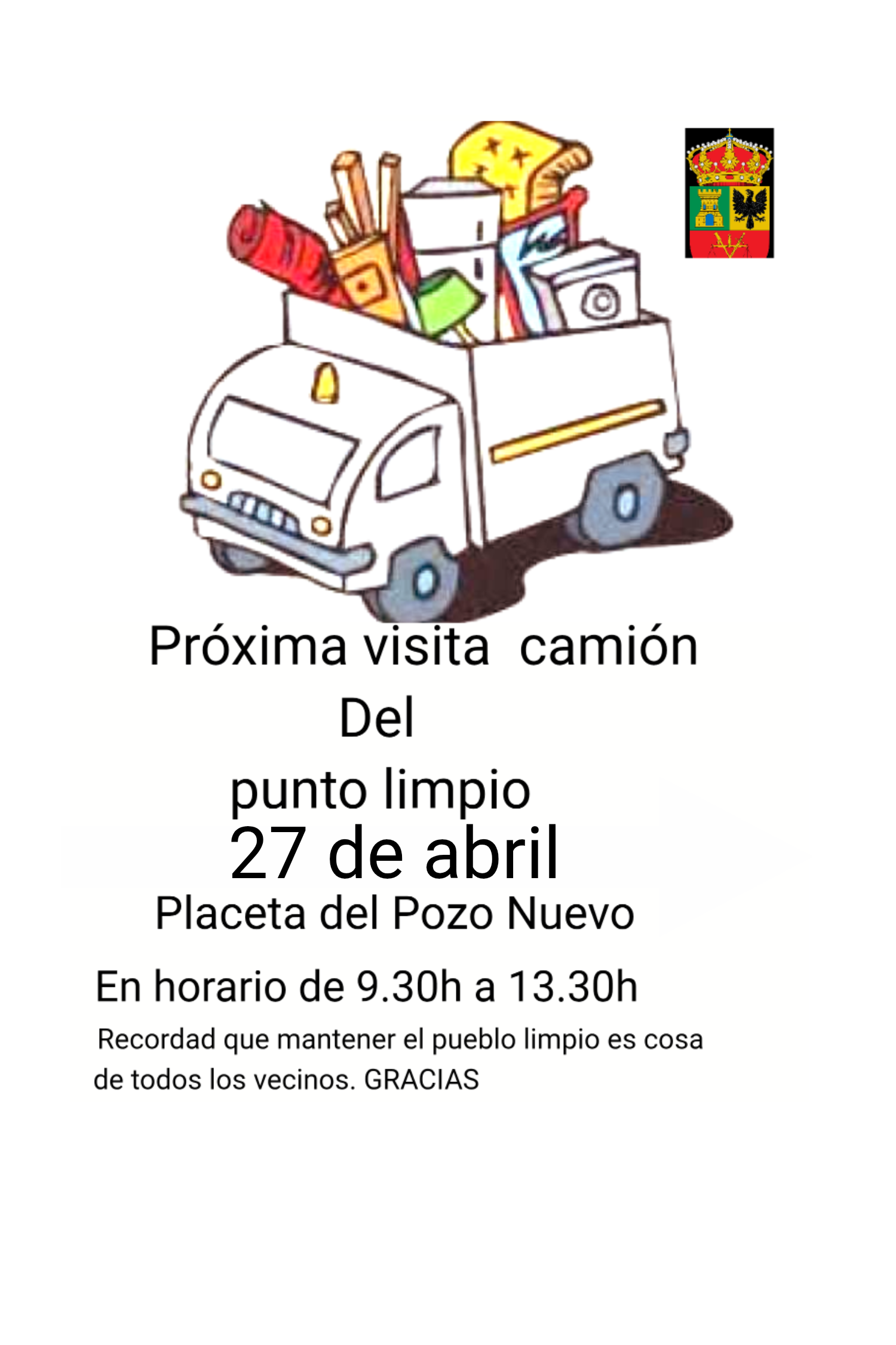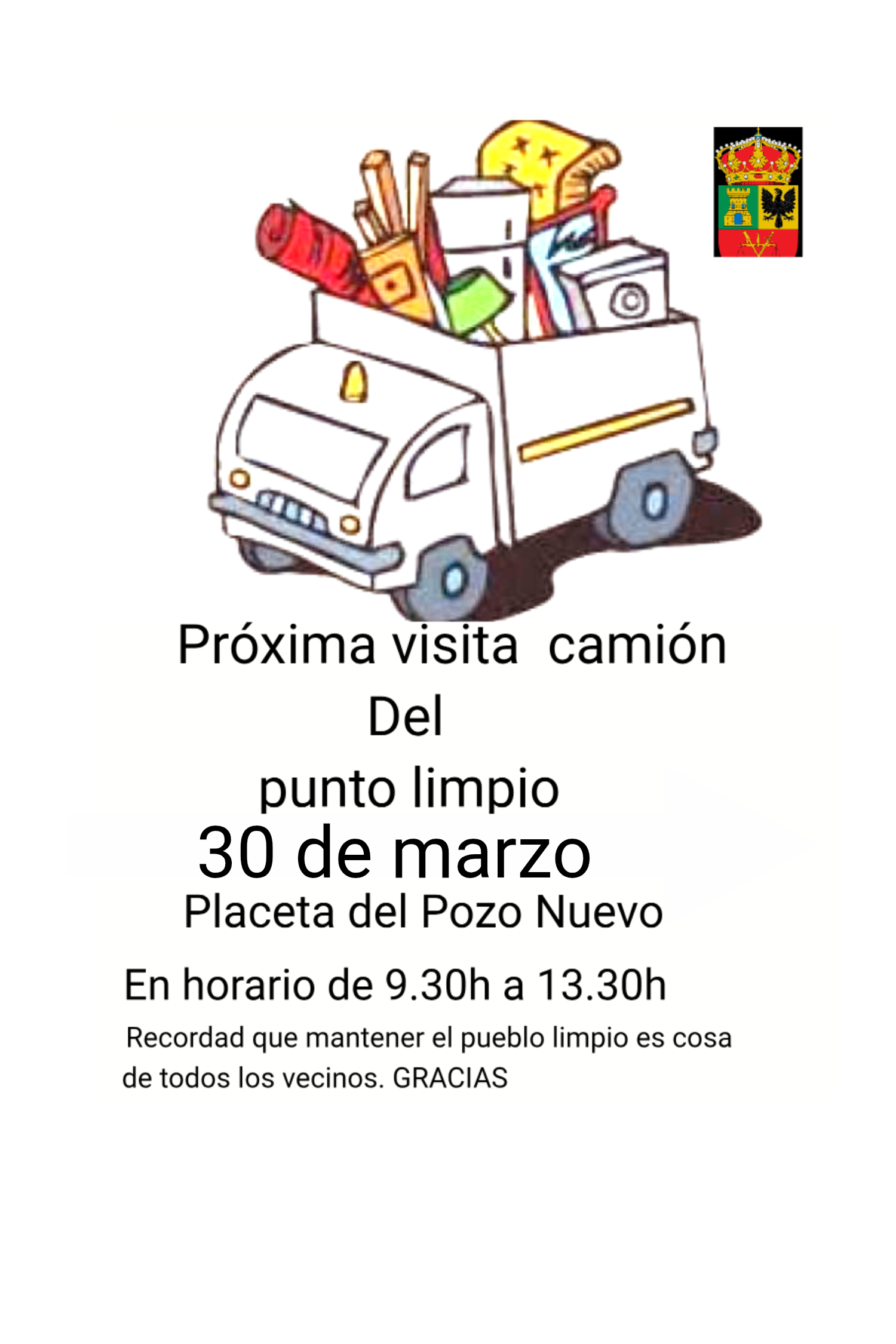 El próximo lunes nos visita el camión 🚚 del punto limpio en horario y ubicación habitual. Recordad que mantener el municipio limpio es cosa de todos los vecinos y vecinas. GRACIAS