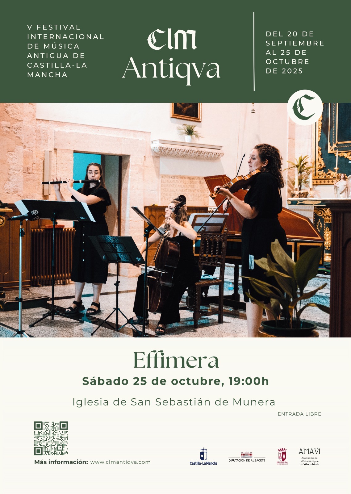 Sábado 25 de octubre, a las 19:00 horas. La Iglesia de San Sebastián acogerá el concierto del grupo Effimera, dentro del V Festival Internacional de Música Antigua de Castilla-La Mancha (CLM Antiqua).