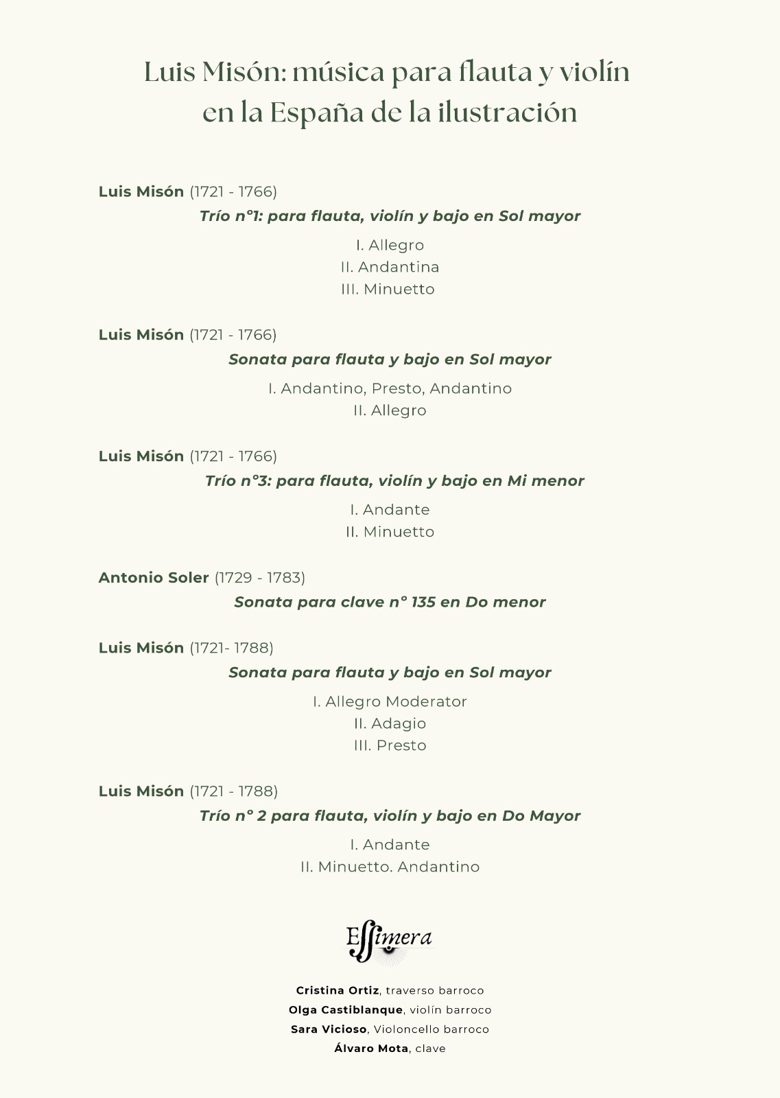 Bajo el título “Luis Misón: música para flauta y violín en la España de la Ilustración”, el conjunto interpretará obras de los compositores Luis Misón y Antonio Soler, utilizando instrumentos barrocos originales.