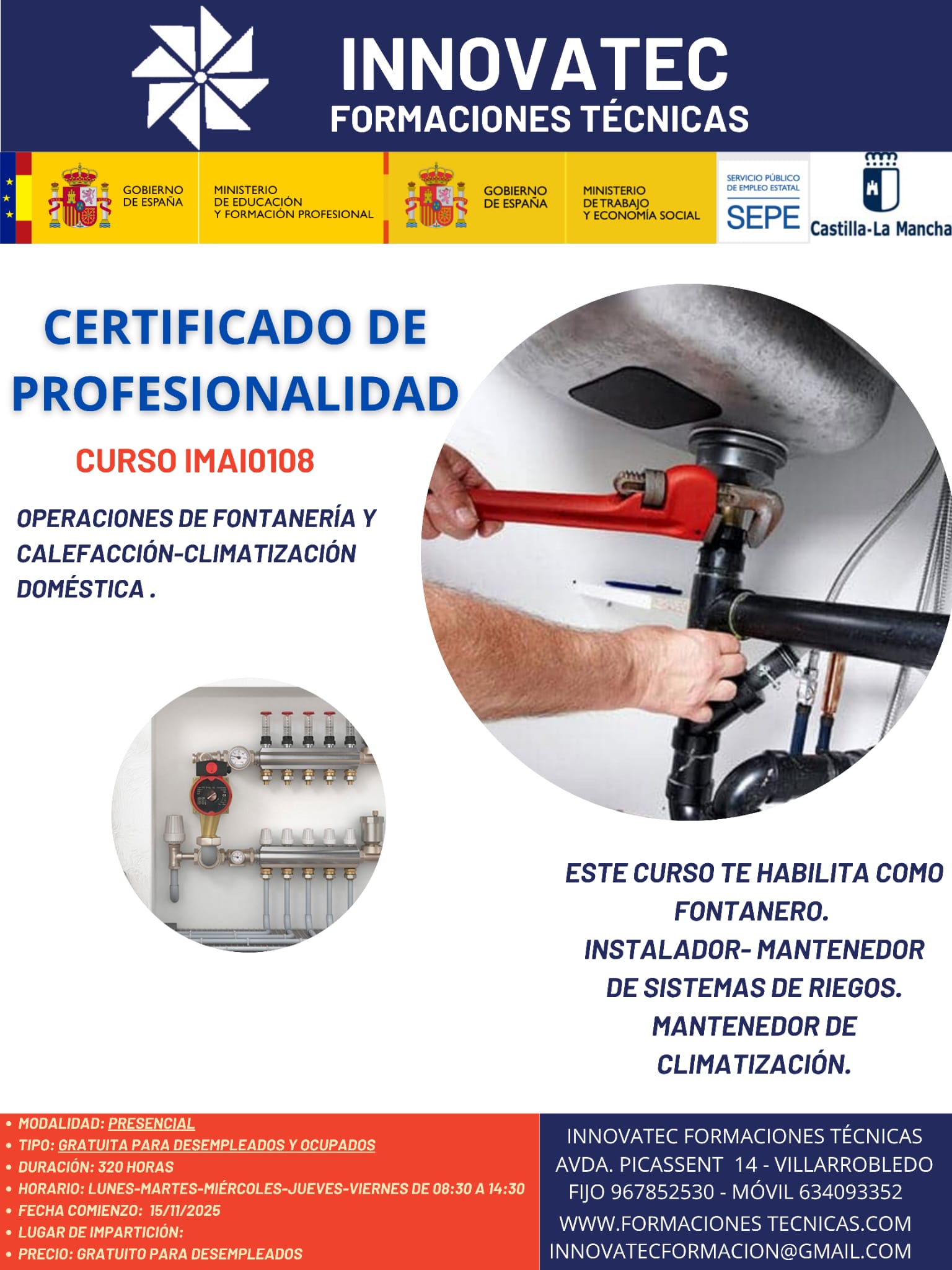 Abierto el plazo de inscripción para el Certificado de Profesionalidad en Operaciones de Fontanería y Calefacción-Climatización Doméstica (IMAI0108).