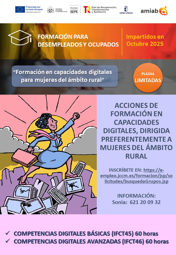 El próximo 28 de octubre, desde AMIAB, se va a llevar a cabo, en la localidad de Munera, una acción formativa perteneciente al Proyecto enmarcado en Acciones de formación en capacidades digitales, dirigidas preferentemente a mujeres en el ámbito rural, para la ejecución del componente 19 Plan Nacional de Competencias Digitales (digital skills) del Plan de Recuperación, Transformación y Resilencia, financiado por la Unión Europea -Next Generation EU(...)