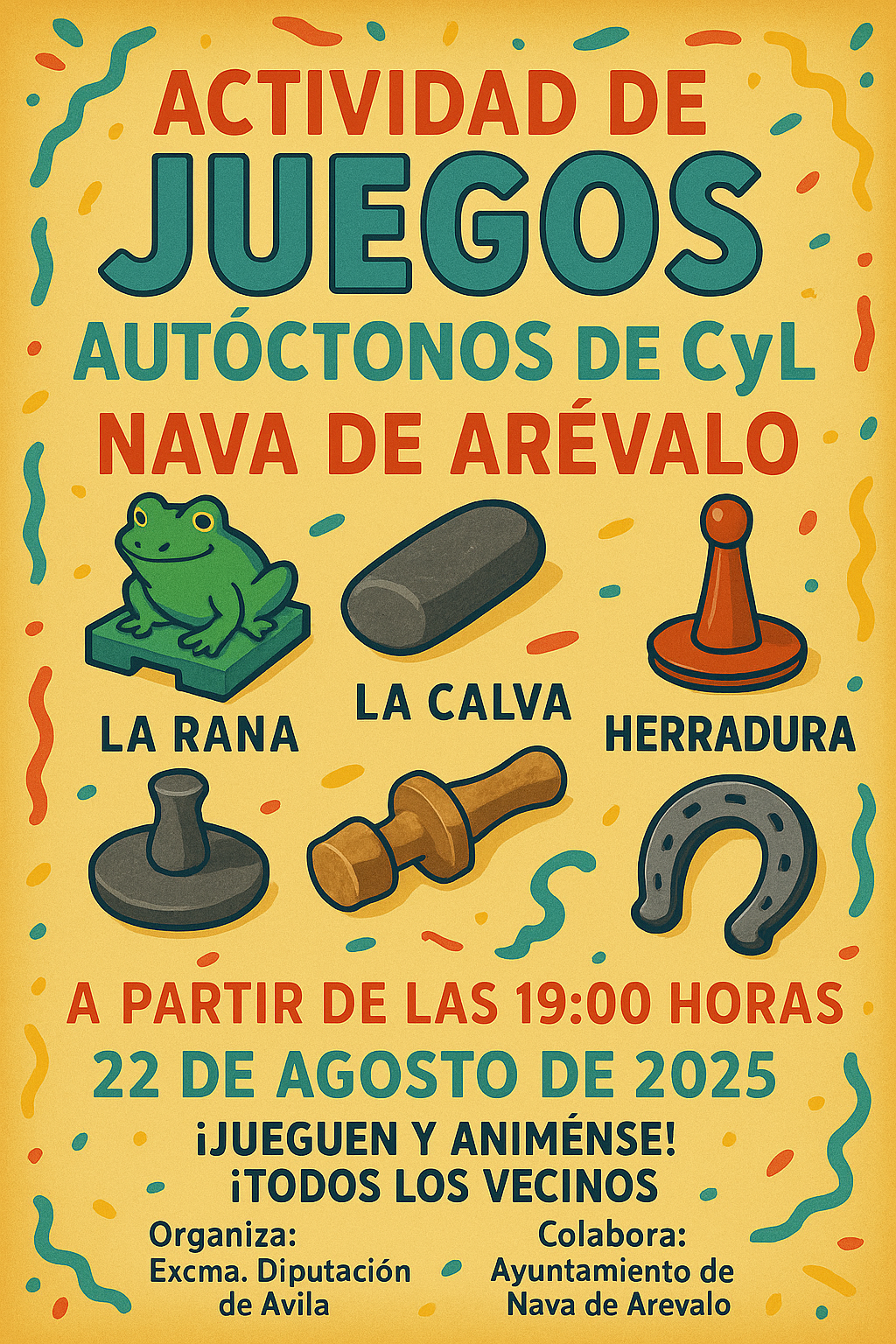 Se pone en conocimiento de todos los vecinos de Nava de Arévalo que el próximo 22 de agosto de 2025, a partir de las 19:00 horas, se celebrará en nuestro municipio una "Actividad de Juegos Autóctonos de Castilla y León".