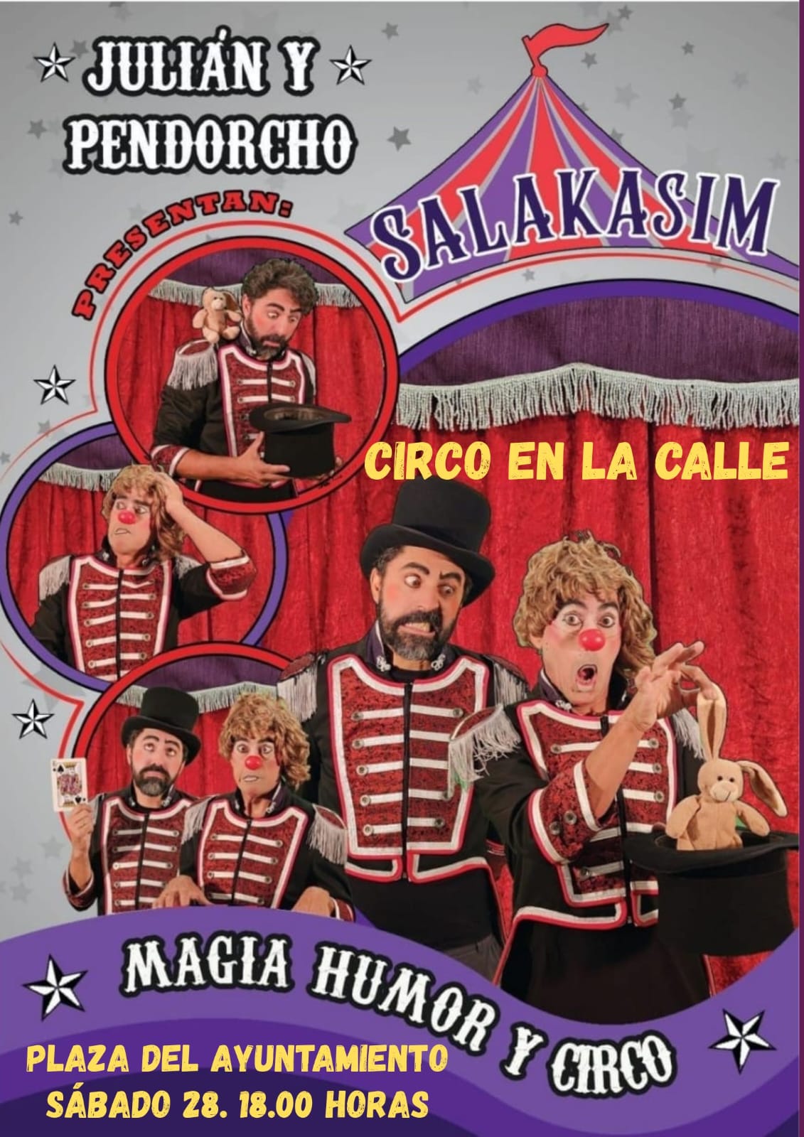 MAÑANA sábado día 28 a las 18:00 horas en la PLAZA DEL AYUNTAMIENTO, podrás disfrutar en familia del espectáculo "SALAKASIM" con Julián y Pendorcho.