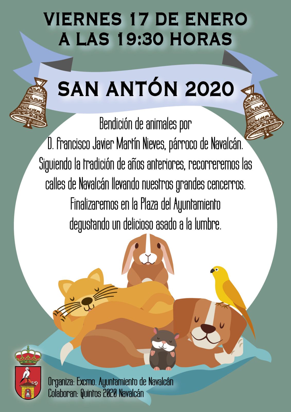 SAN ANTÓN 20202020-01-16 14:00:02Info GeneralMAÑANA Viernes día 17 de Enero a las 19:30 de la tarde celebraremos SAN ANTÓN en la Plaza de la Constitución (Ayuntamiento), con bendición de los animales por el cura párroco y posteriormente recorreremos las calles de la localidad con cencerros.
