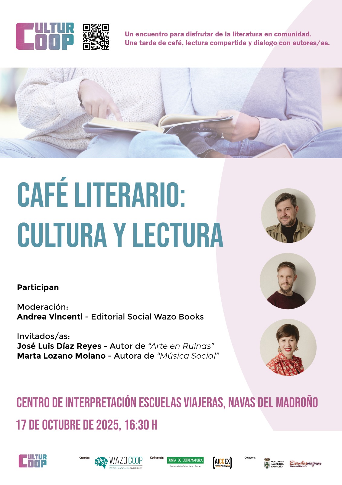Se comparte información de la actividad "Café Literario: Cultura y Lectura en Comunidad", que tendrá lugar hoy, día 17 de octubre, a partir de las 16:30h, en el Centro de Interpretación Escuelas Viajeras. Se trata de un espacio para compartir literatura, diálogo y cooperación cultural en el marco de Cultur Coop 2025.