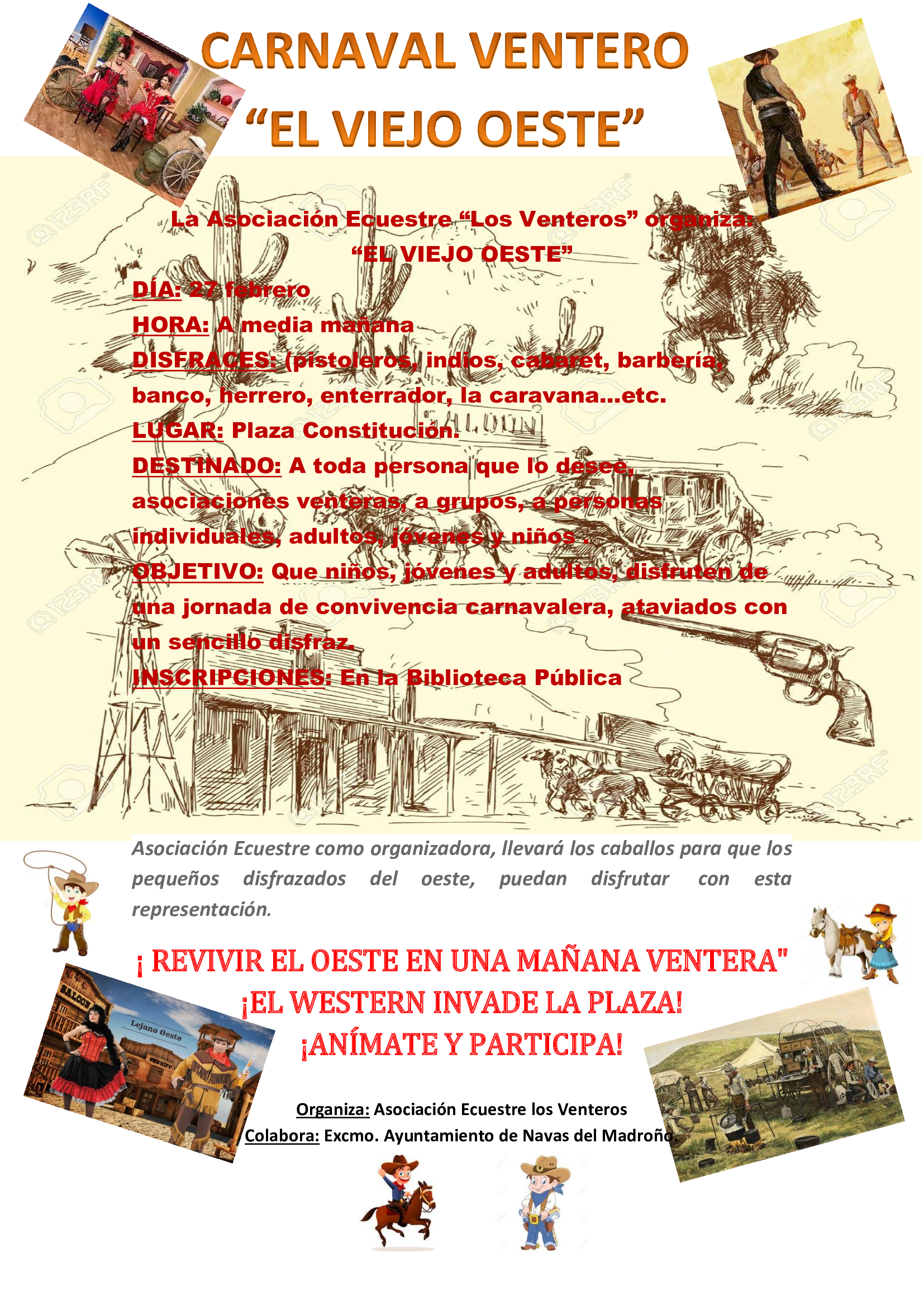 El domingo día 27 de febrero por la mañana, la Asociación Ecuestre, propone realizar el carnaval “EL OESTE” (pistoleros, indios, cabaret, barbería, banco, herrero, enterrador, la caravana…etc .cada asociación o grupo, o personas individuales, niños, jóvenes y adultos deben disfrazarse de un motivo o varios)