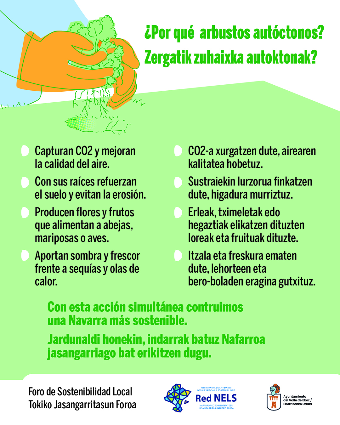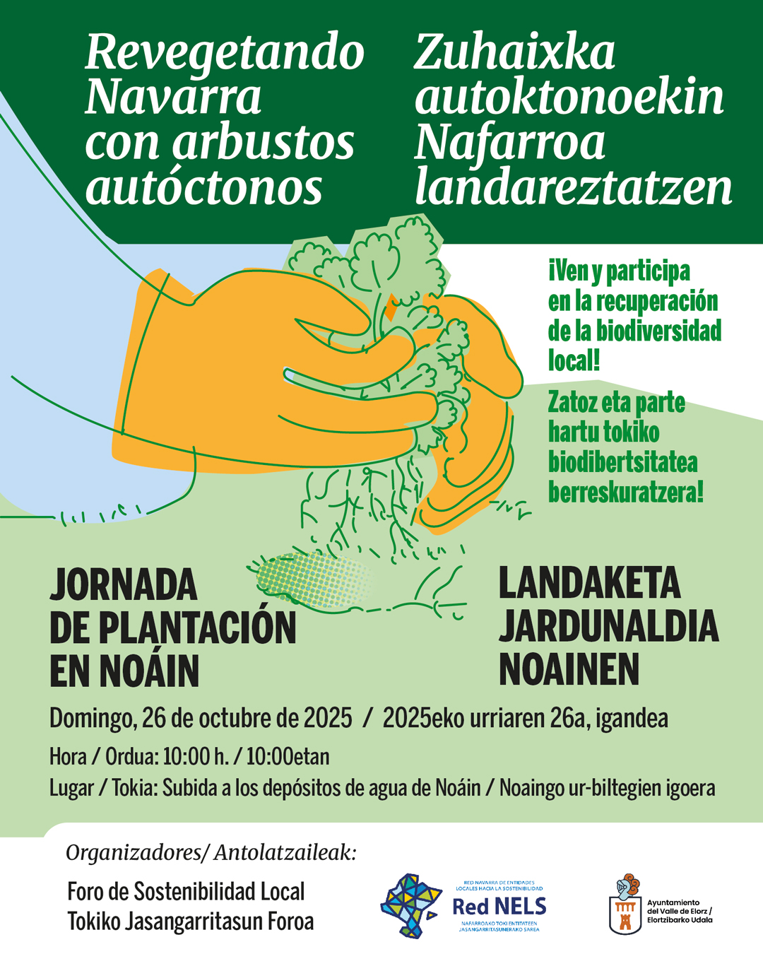 El domingo de la semana que viene, 26 de octubre, hemos organizado desde el Ayuntamiento del Valle de Elorz una jornada de Voluntariado Ambiental. Vamos a plantar arbustos autóctonos para adaptar nuestro territorio a los efectos del cambio climático. Esta actividad se va a realizar simultáneamente en varios pueblos dentro de la semana del clima de Navarra. En nuestro municipio será a las 10.00 en la subida a los depósitos de agua de Noáin.