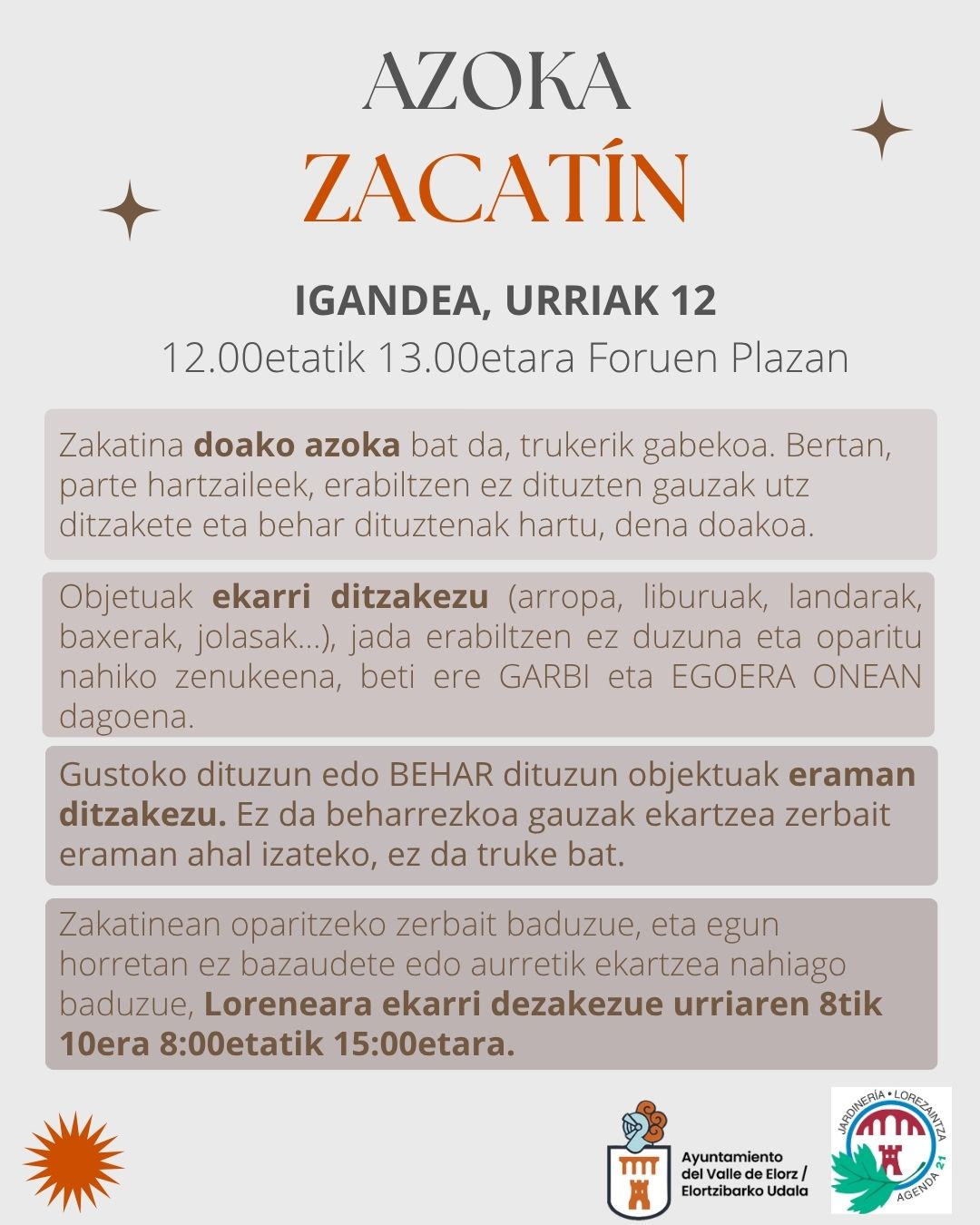 El próximo DOMINGO 12 de OCTUBRE de 12.00 a 13.30, se celebra un nuevo Zacatín en la Plaza de Los Fueros de Noáin.