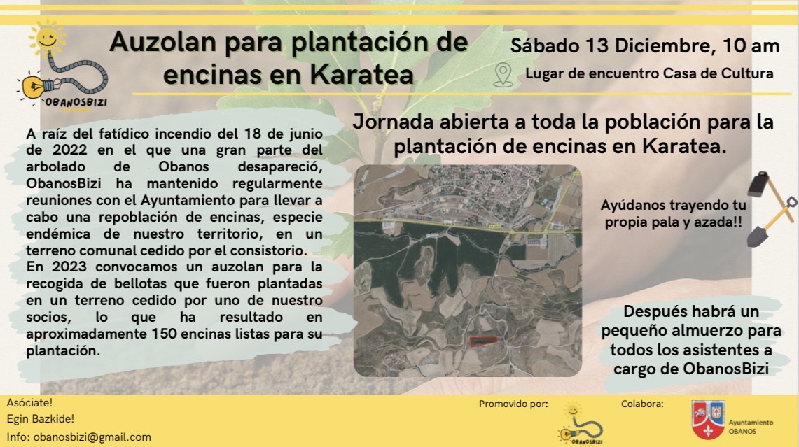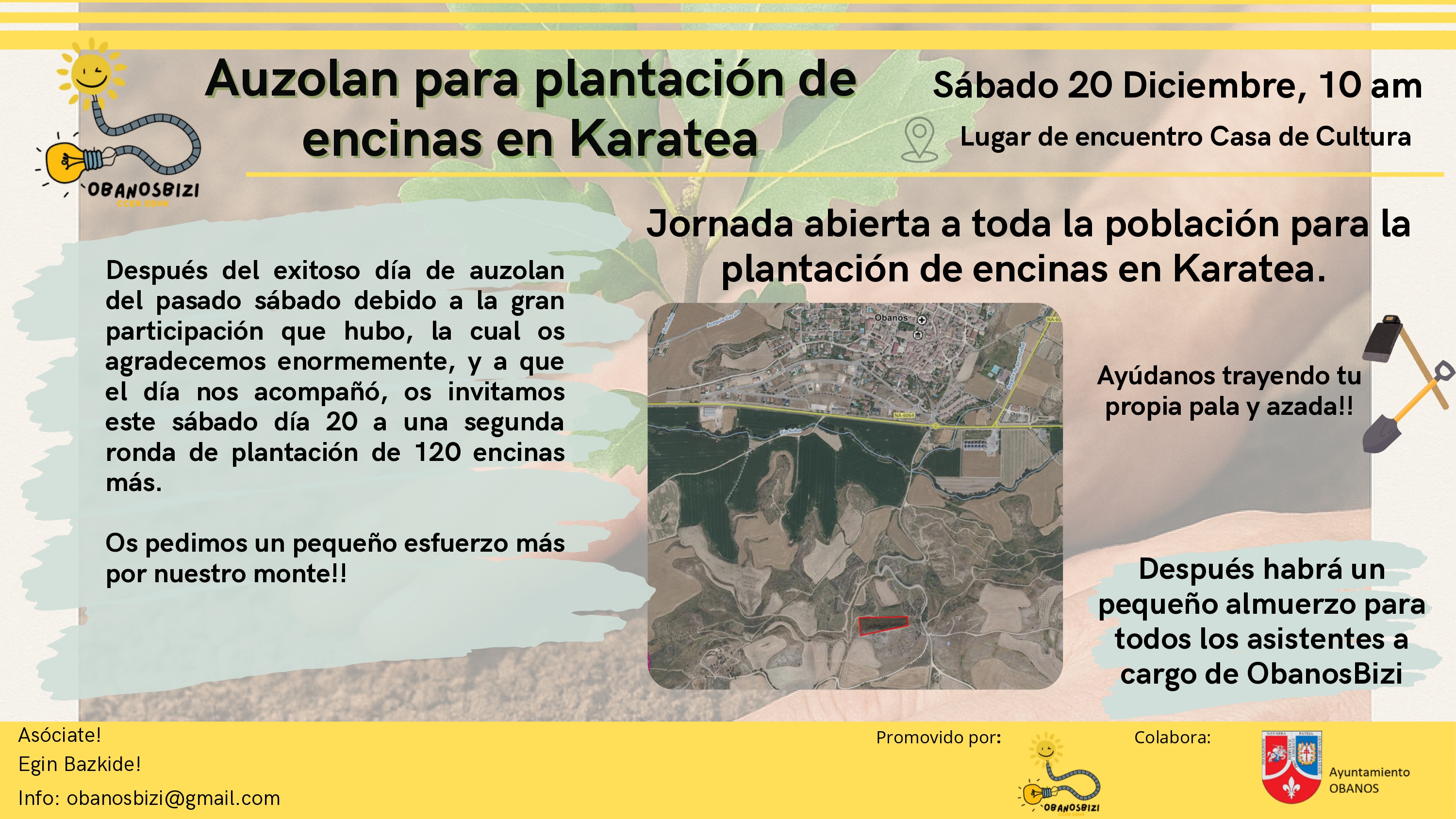 Tras el exitoso día de Auzolan para la plantación de encinas que tuvimos el pasado sábado, os pedimos un pequeño esfuerzo más y os invitamos a participar este sábado día 20 de nuevo en la plantación de 120 encinas más.