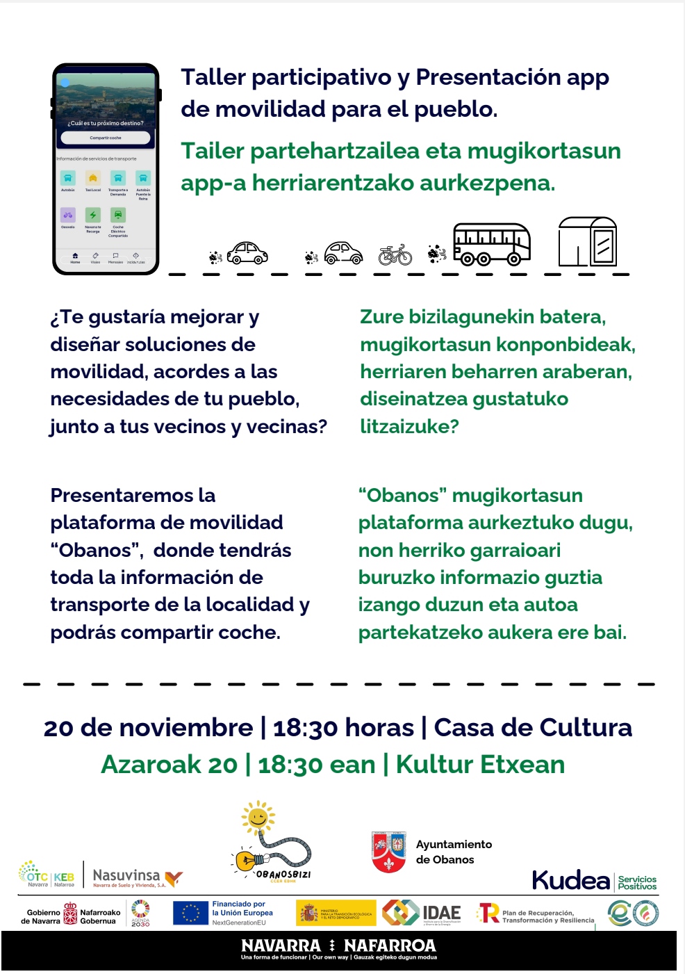 Desde ObanosBizi os invitamos a la presentacion de la nueva aplicación de movilidad "Obanos". Será el próximo 20 de noviembre a las 18:30 h en la Sala de Cultura. Si quieres conocer como mejorar la movilidad en Obanos y tener un lugar con toda la información sobre el transporte en la localidad, te animamos a asistir.