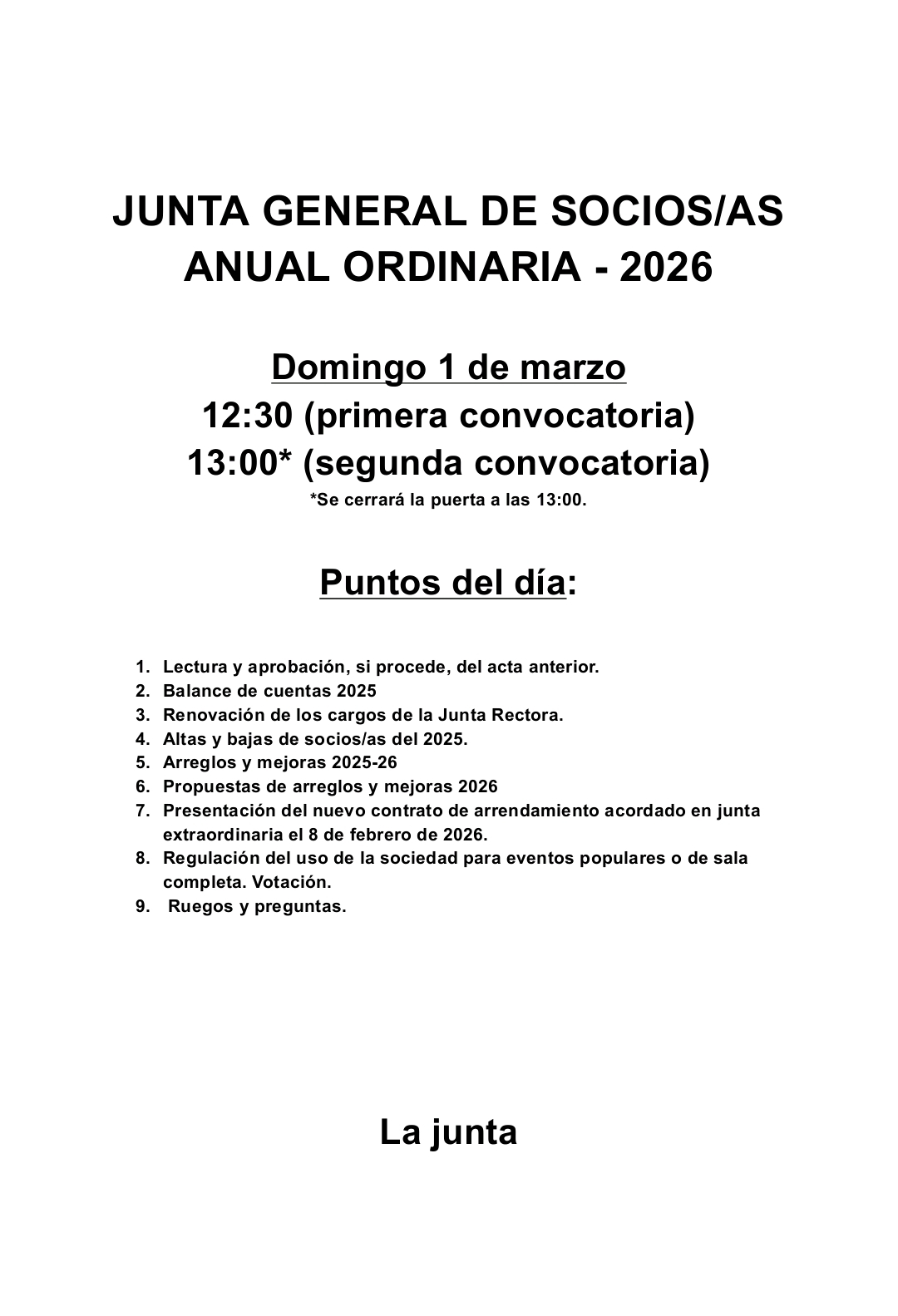 Recordamos que se cerrará la puerta a las 13:00. Se ruega puntualidad.