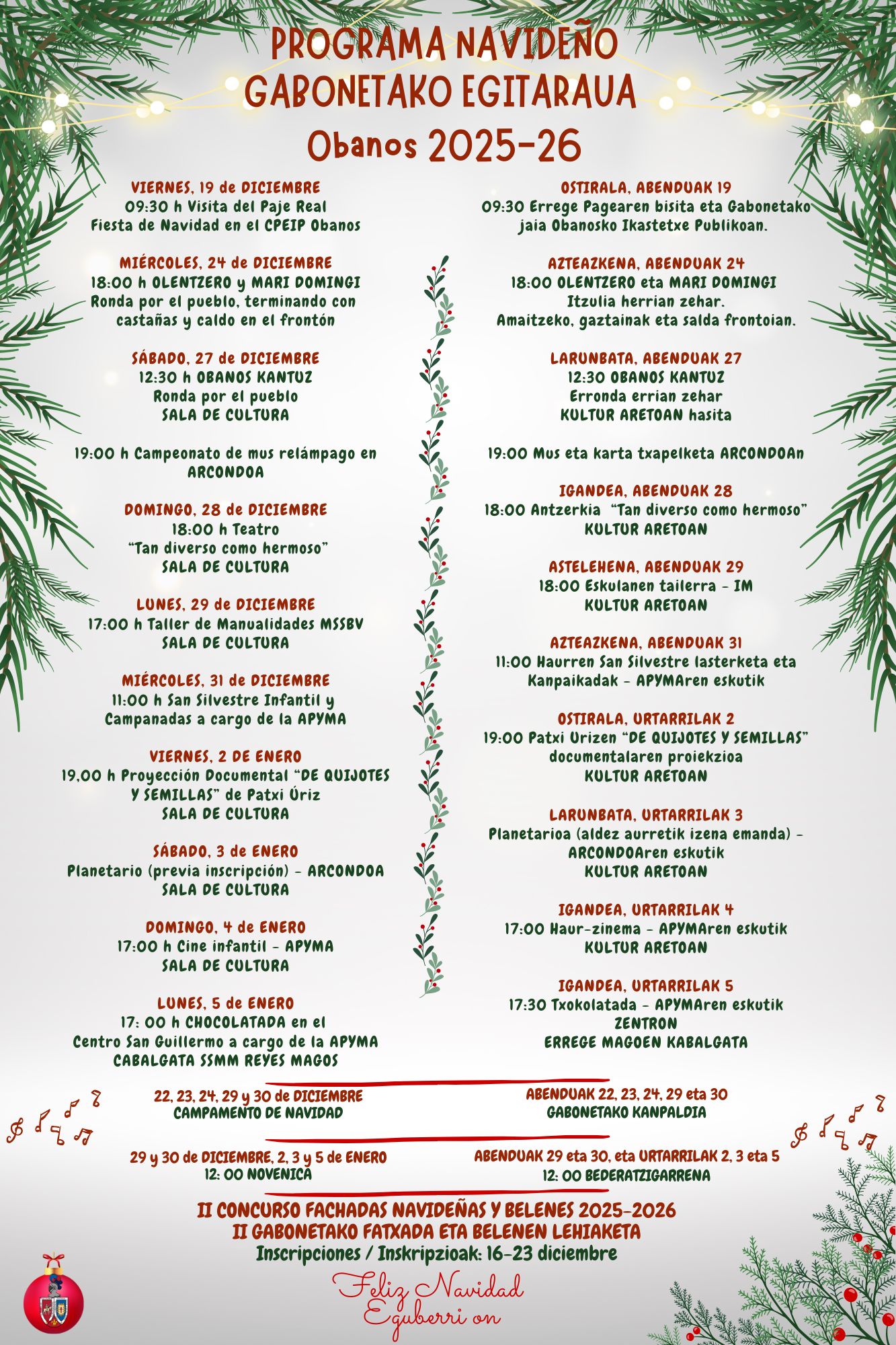 Desde el Ayuntamiento de Obanos y con la colaboración de diferentes asociaciones y colectivos del pueblo os presentamos una programación navideña muy completa y variada, y para todos los públicos. ¡Esperamos que la disfrutéis!
