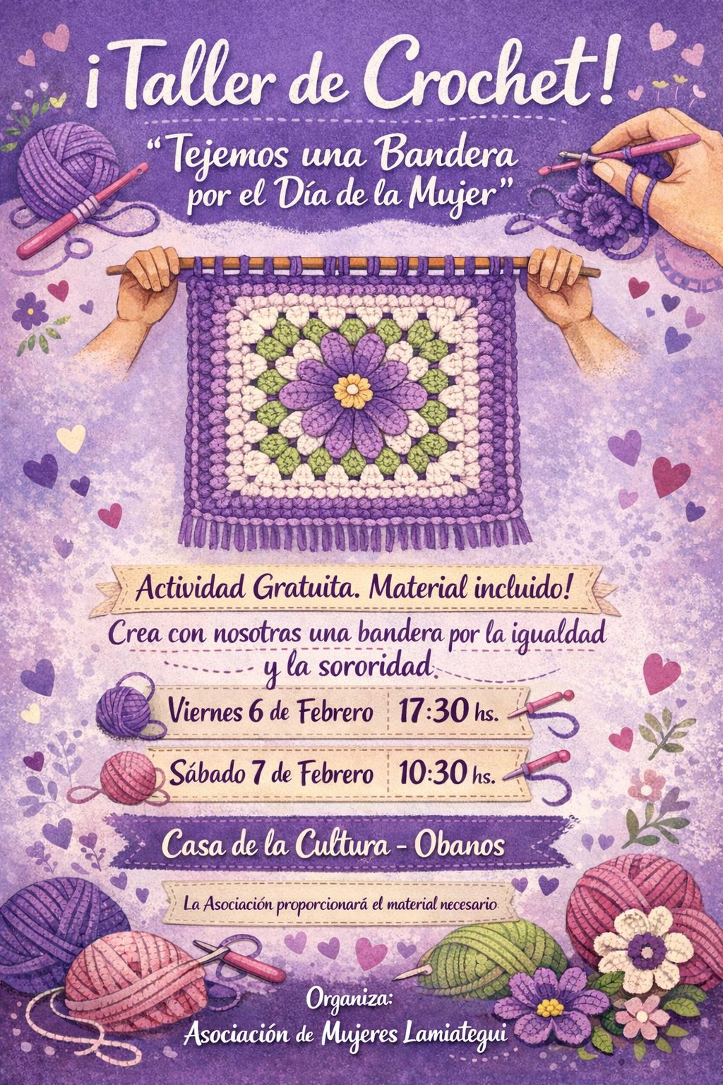 La asociación de mujeres Lamiategui está organizando varias actividades con motivo del día de la mujer y les gustaría invitaros a participar en el taller de crochet que han preparado.