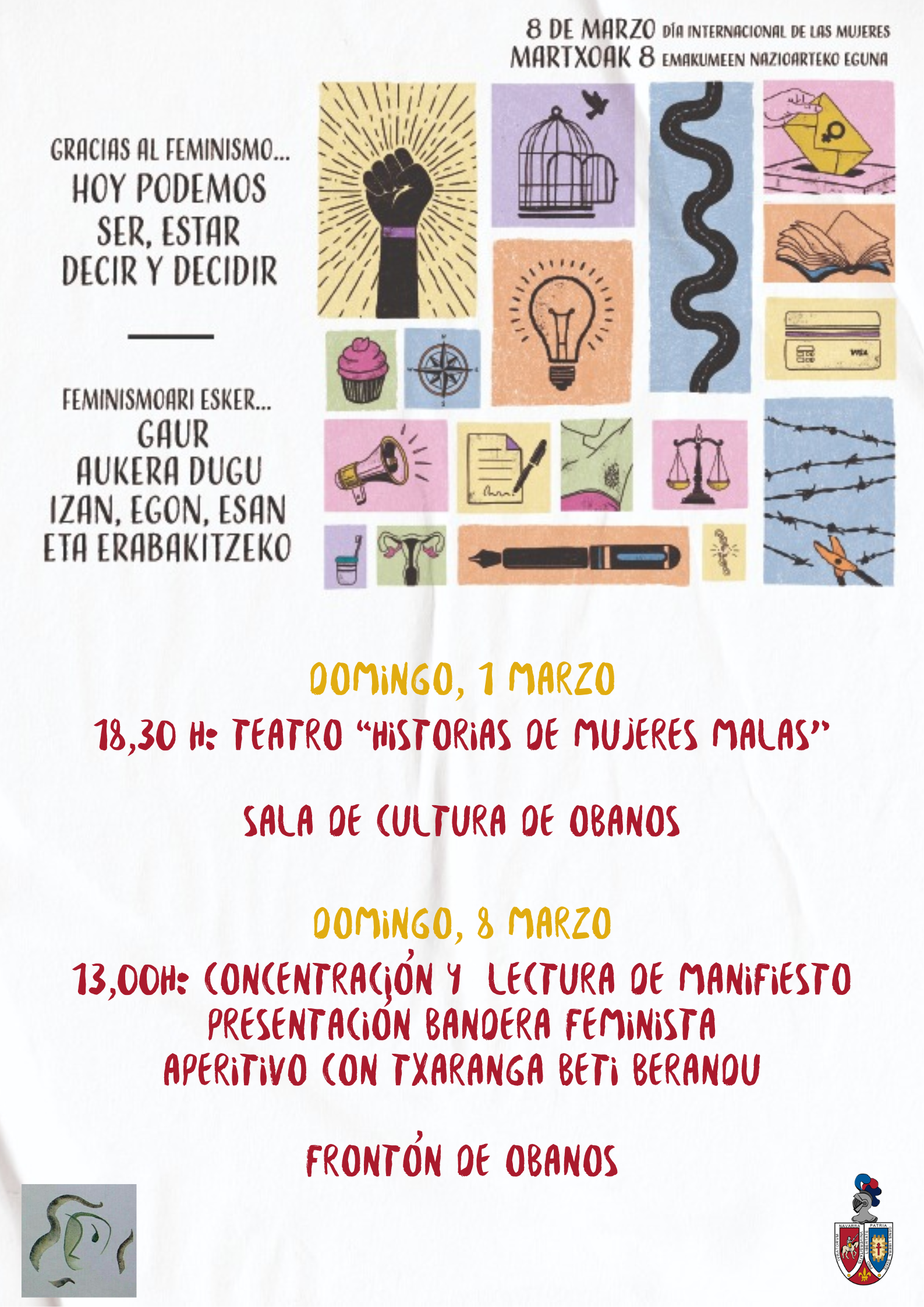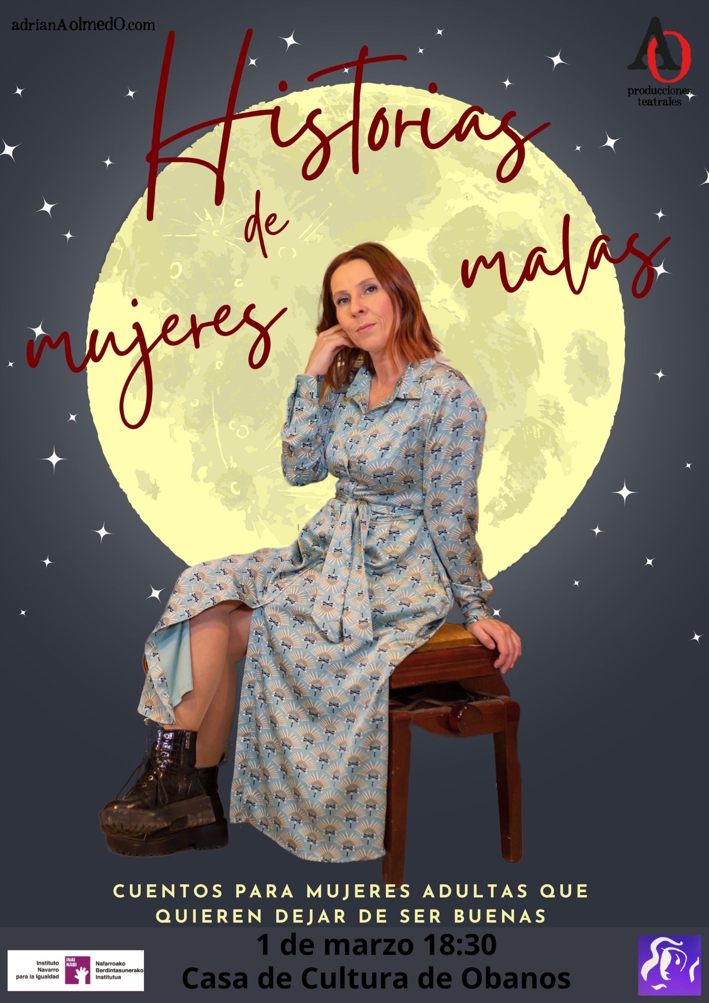 El domingo, 1 de marzo a las 18,30h en la Sala de Cultura de Obanos, contaremos con Adriana Olmedo con su obra de teatro "Historias de mujeres malas".