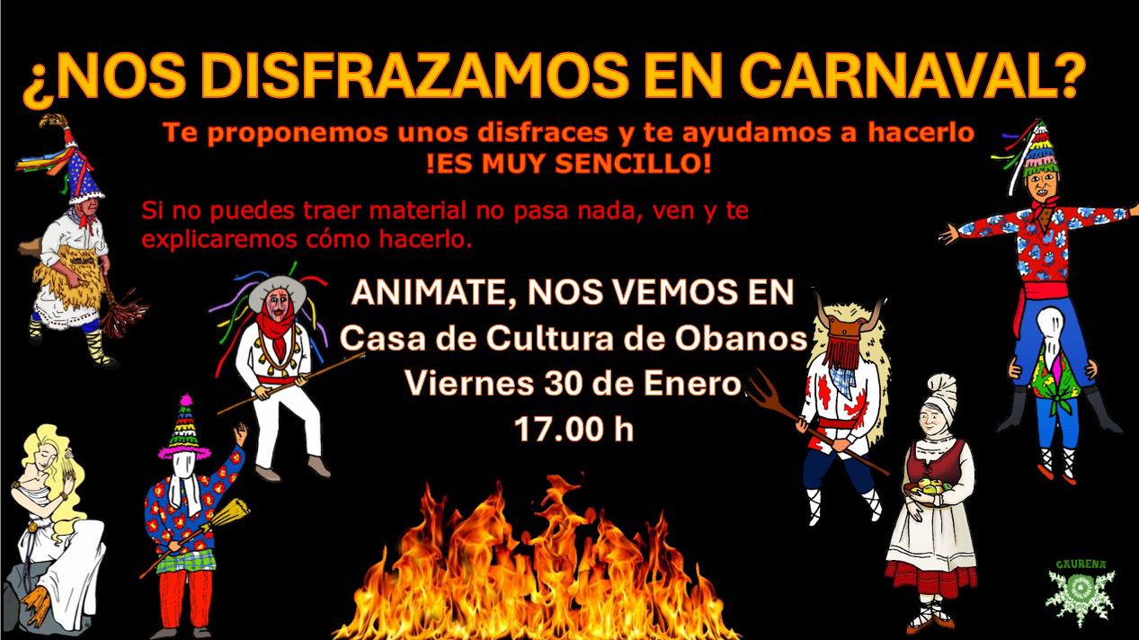 Este viernes 30 de enero a las 17:00, en la casa de cultura, la asociación Gaurena nos invita a participar en una actividad en la que nos enseñarán a hacer disfraces para el carnaval. Animaros!!.
