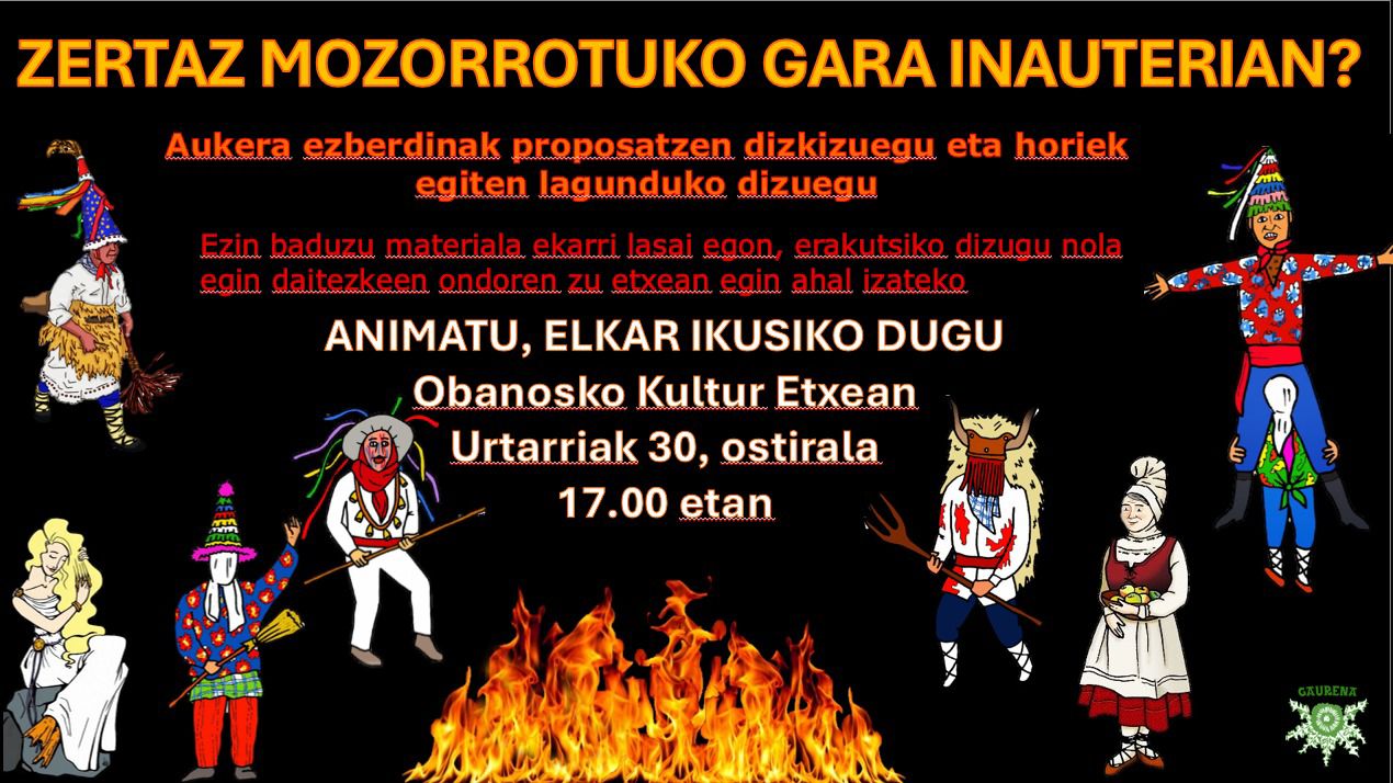 Ostiral honetan, urtarrilaren 30ean, 17:00etan, kultur etxean, Gaurena elkarteak inauterietarako mozorroak egiten irakatsiko diguten ekitaldi batean parte hartzera gonbidatzen gaitu. Animatu!!