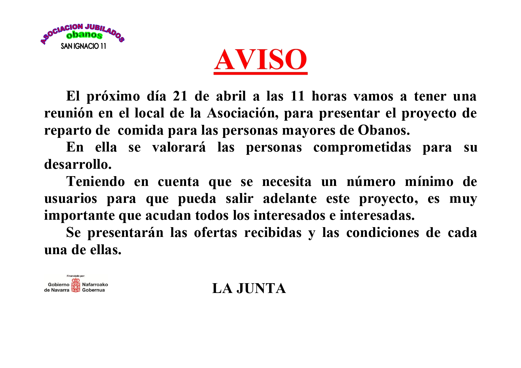 El próximo día 21 de abril a las 11 horas vamos a tener una reunión en el local de la Asociación, para presentar el proyecto de