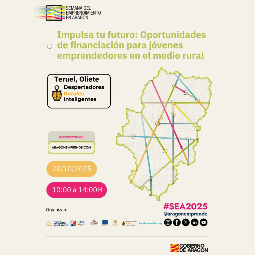 La Semana del Emprendimiento de Aragón 2025 llega a Oliete con una jornada abierta sobre oportunidades de financiación. Esta iniciativa, impulsada por el Gobierno de Aragón a través de la Fundación Aragón Emprende, cuenta con la colaboración de Apadrinaunolivo.org y Despertadores Rurales Inteligentes.