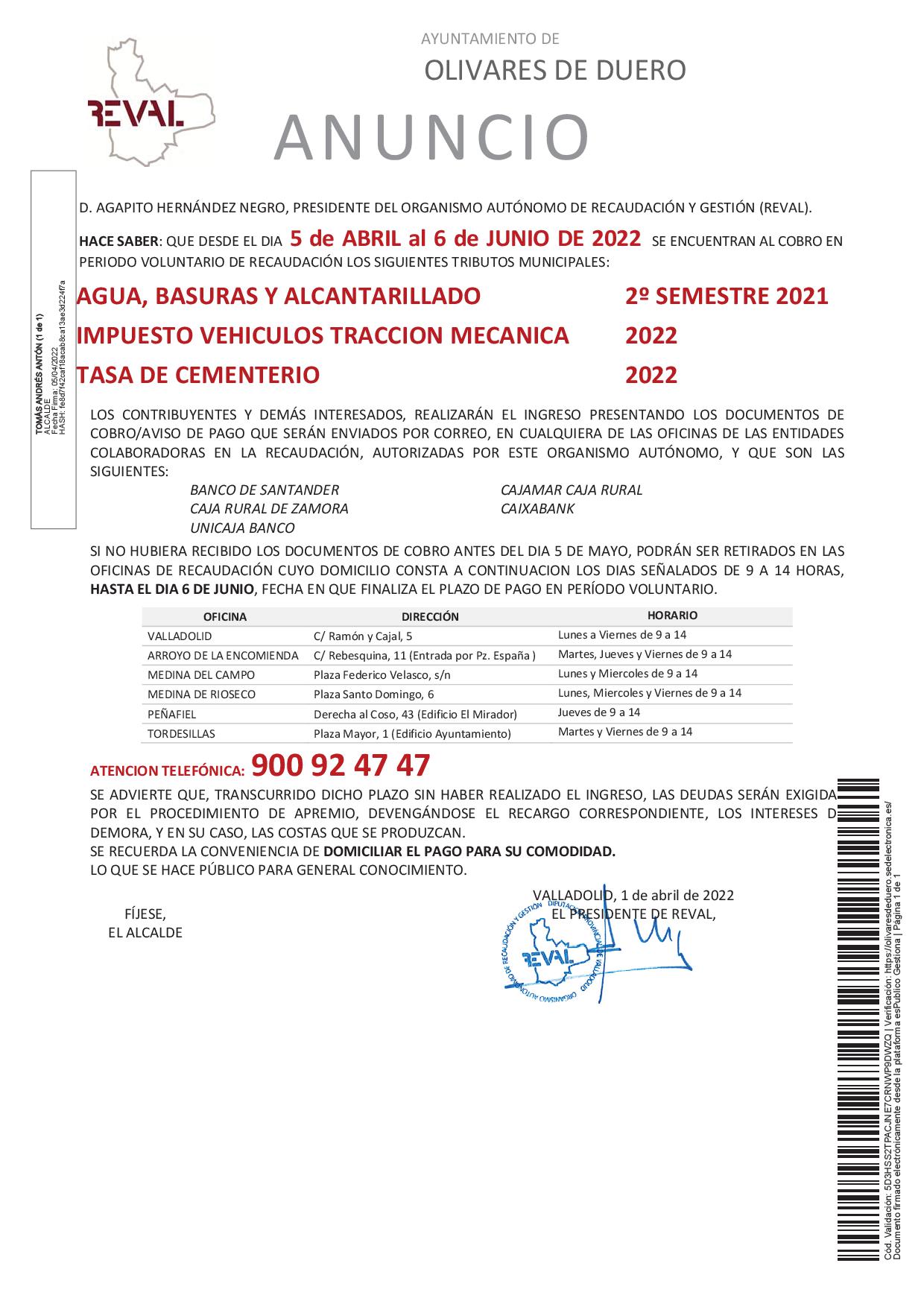 ANUNCIO COBRO RECIBOS REVAL EN PERIODO VOLUNTARIO HASTA EL 6 DE JUNIO DE 2022