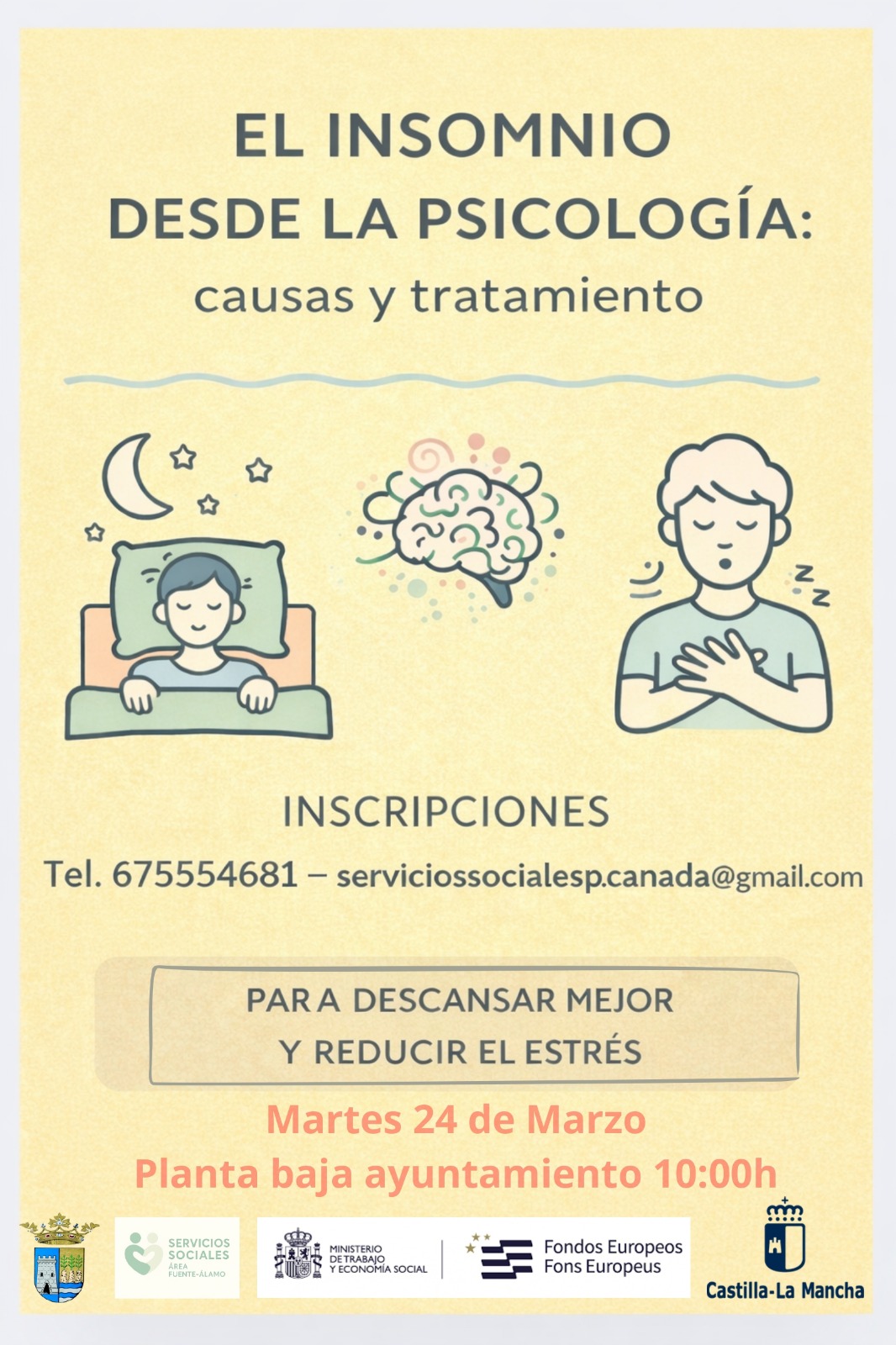 SE INFORMA AL PÚBLICO EN GENERAL QUE EL PRÓXIMO MARTES 24/03/2026 A LAS 10 H EN EL SALÓN DE LOS BAJOS DEL AYUNTAMIENTO TENDRÁ LUGAR UNAS CHARLAS INFORMATIVAS SOBRE LAS CAUSAS Y TRATAMIENTOS DEL INSOMNIO, LAS INSCRIPCIONES LAS PUEDEN HACER EN EL TELEFONO 675 55 46 81 O EN EL EMAIL SERVICIOSSOCIALESP.CANADA@GMAIL.COM.