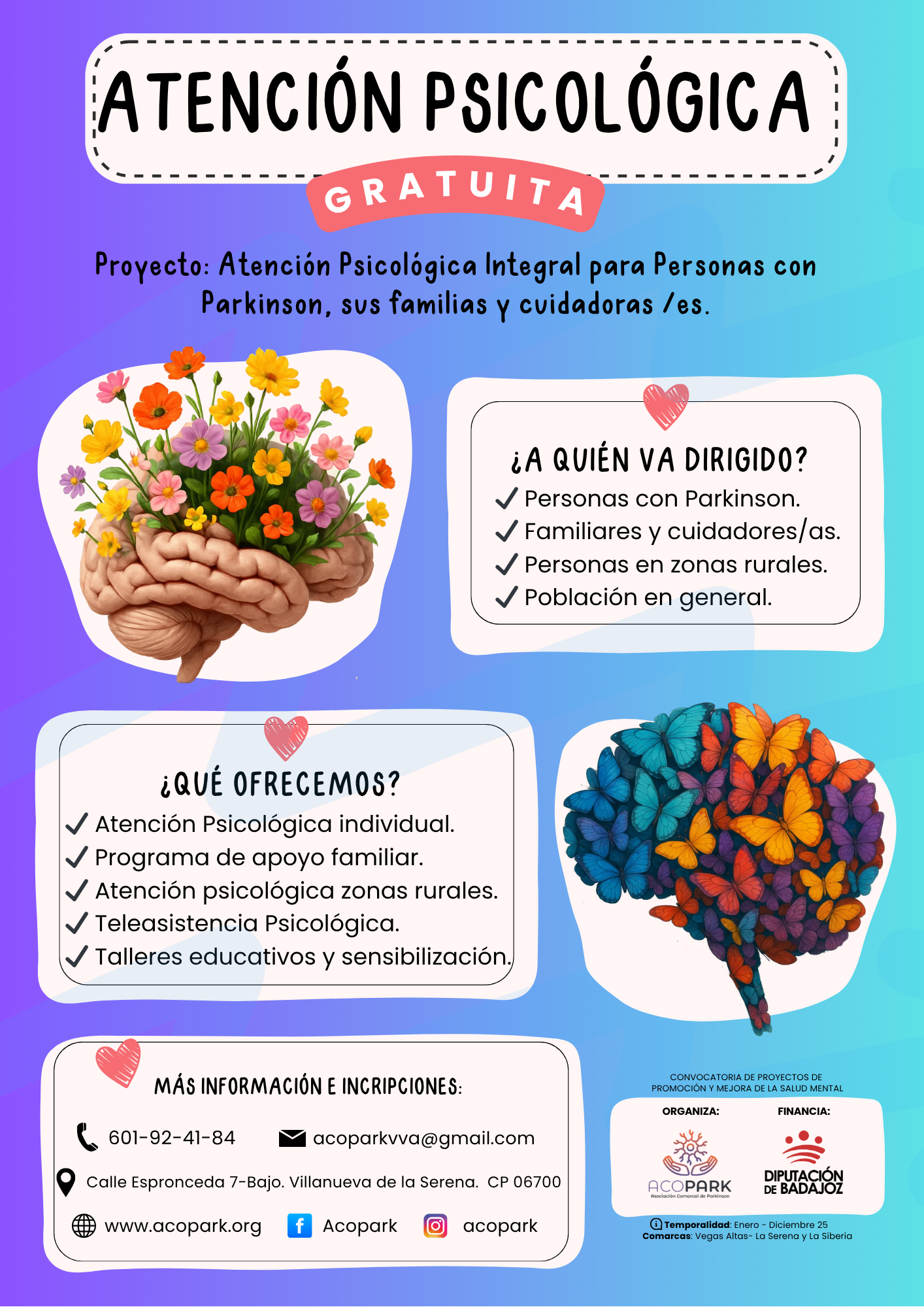 La Asociación Comarcal de Parkinson (ACOPARK) ofrece el servicio gratuito de atención psicológica dirigido a: