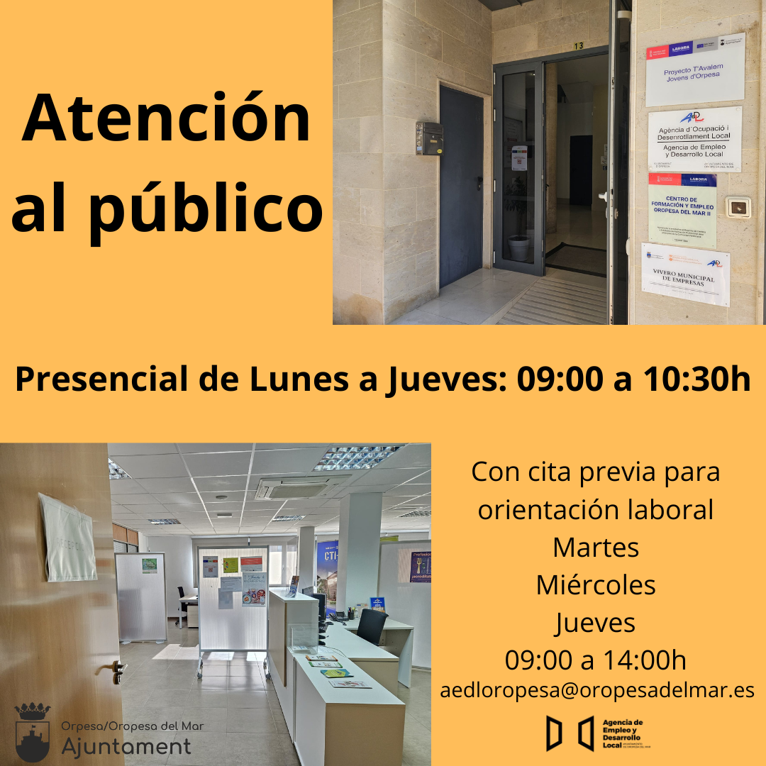 🗣️🏫 L'Ajuntament d'Orpesa, a través de la regidoria d'Ocupació, Desenvolupament Local, Comerç i Emprenedorisme, al costat de l'AEDL, recorda l'horari d'atenció al públic de forma presencial a les instal·lacions del carrer Pius XII nú(...)