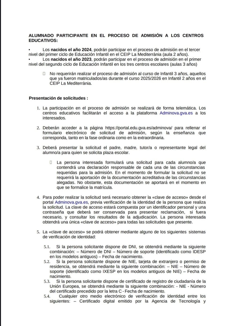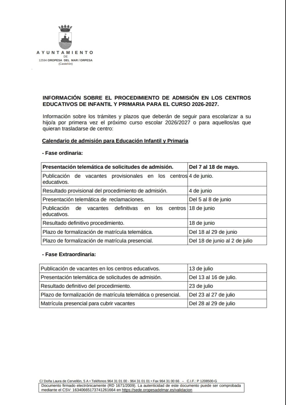 🗣️🏫 El Ayuntamiento de Oropesa del Mar, a través de la concejalía de Educación, informa sobre el procedimiento de admisión en los centros educativos de Infantil y Primaria para el curso 2026-2027