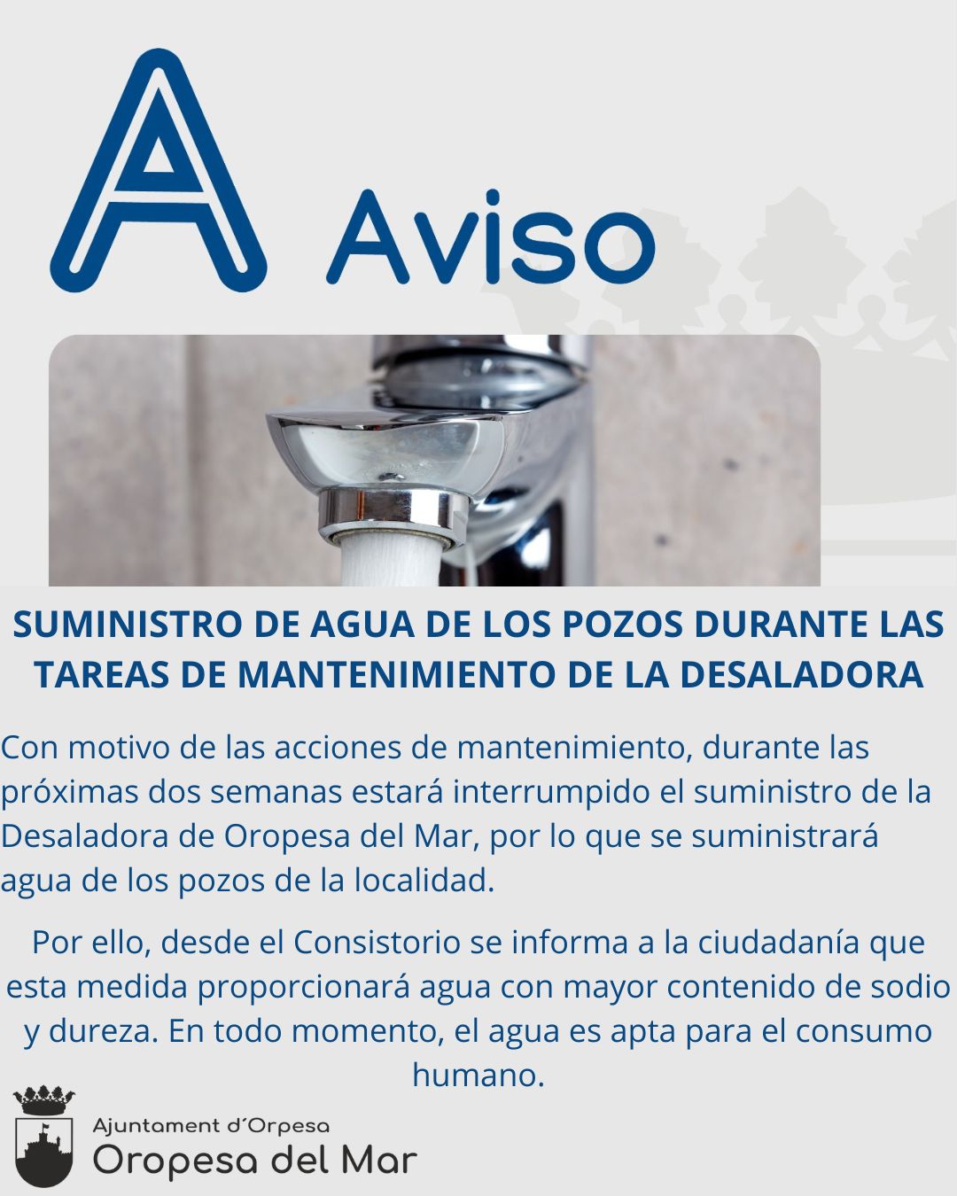 🗣️🏫 El Ayuntamiento de Oropesa del Mar informa que, con motivo de las acciones de mantenimiento, durante las próximas dos semanas estará interrumpido el suministro de la Desaladora de Oropesa del Mar, por lo que se suministrará agua de los pozos de la localidad.