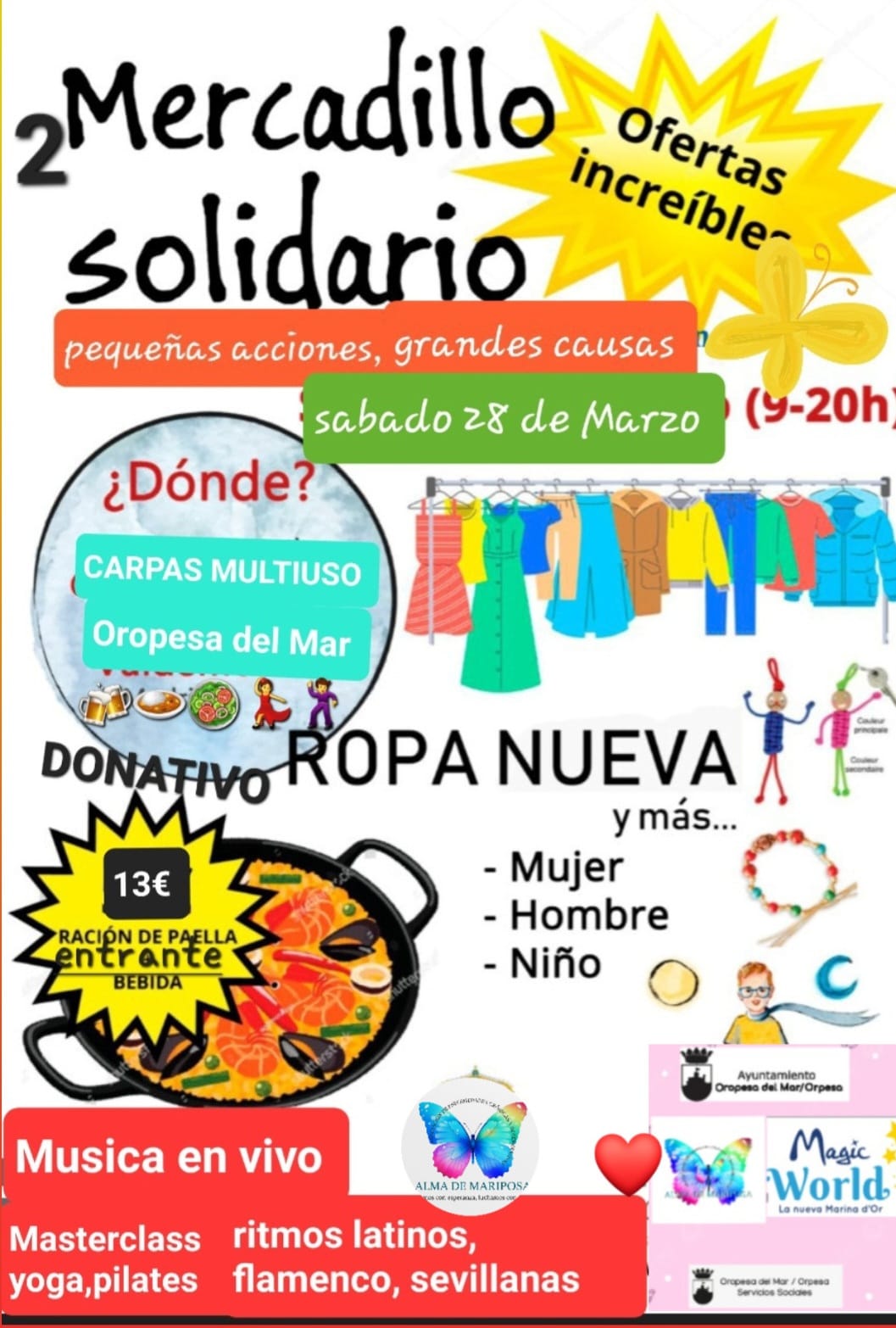 🗣️🏫 El Ayuntamiento de Oropesa del Mar, a través de la concejalía de Servicios Sociales, recuerda que hoy sábado 28 de marzo tendrá lugar el II Mercadillo Solidario a cargo de la Asociación Alma de Mariposa.