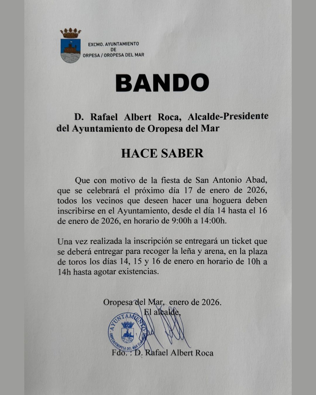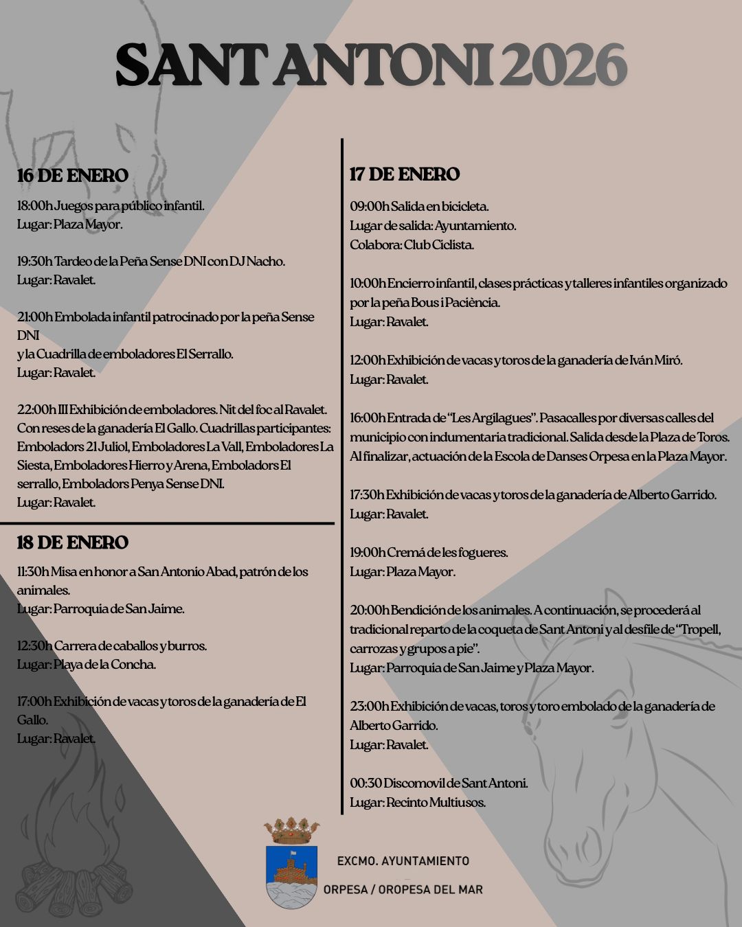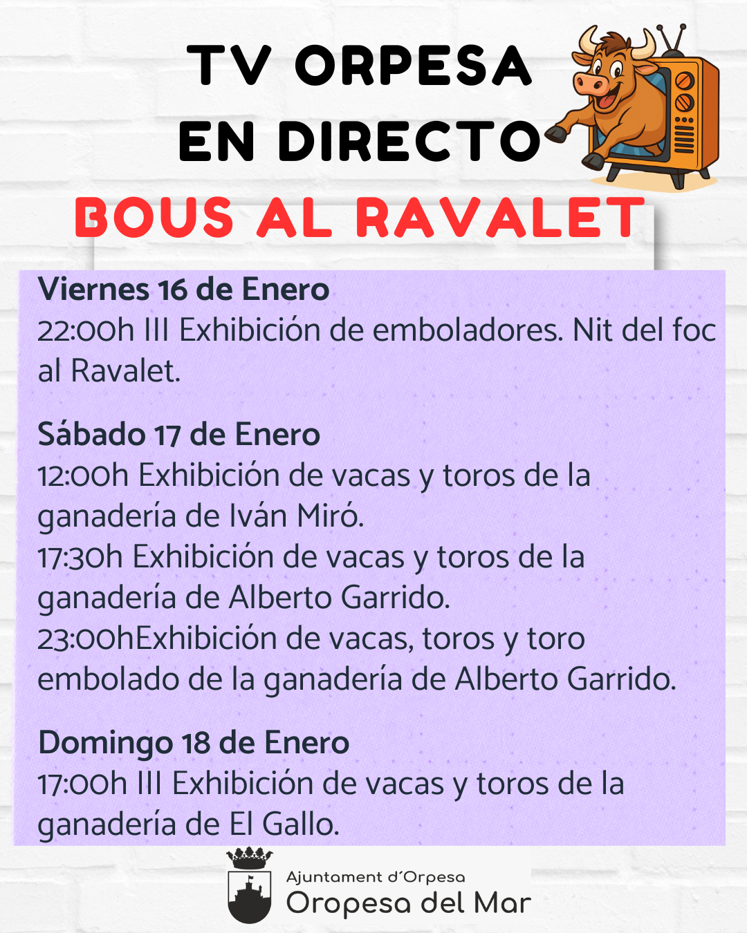 🗣️🏫 L'Ajuntament d'Orpesa informa que, amb motiu de les festes en honor a Sant Antoni 2026, es retransmitiràn en directe els festejos taurins previstos per a aquest cap de setmana, si les condicions climatològiques ho permeten.