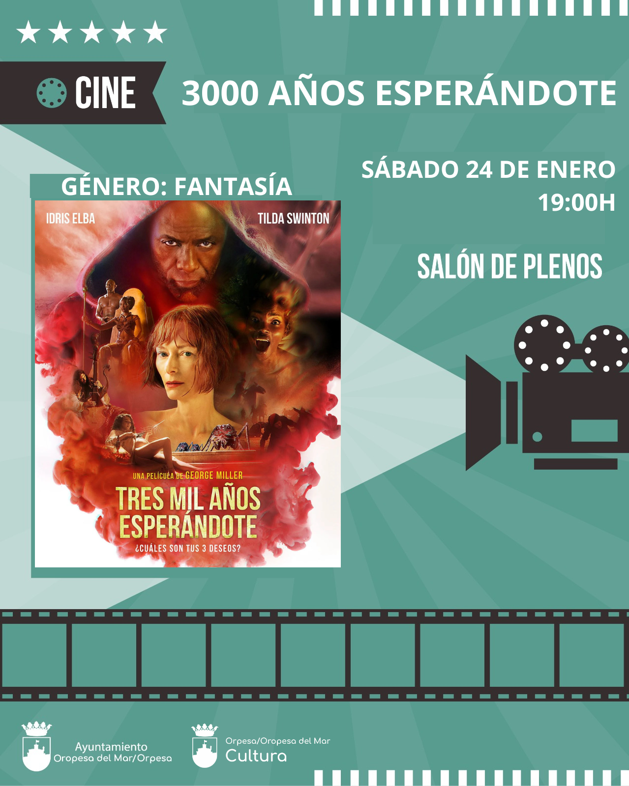 🗣️🏫 El Ayuntamiento de Oropesa del Mar, a través de la concejalía de Cultura, informa que este Sábado 24 de Enero podremos disfrutar de una nueva sesión de cine semanal con la alocada película "3000 años esperándote".