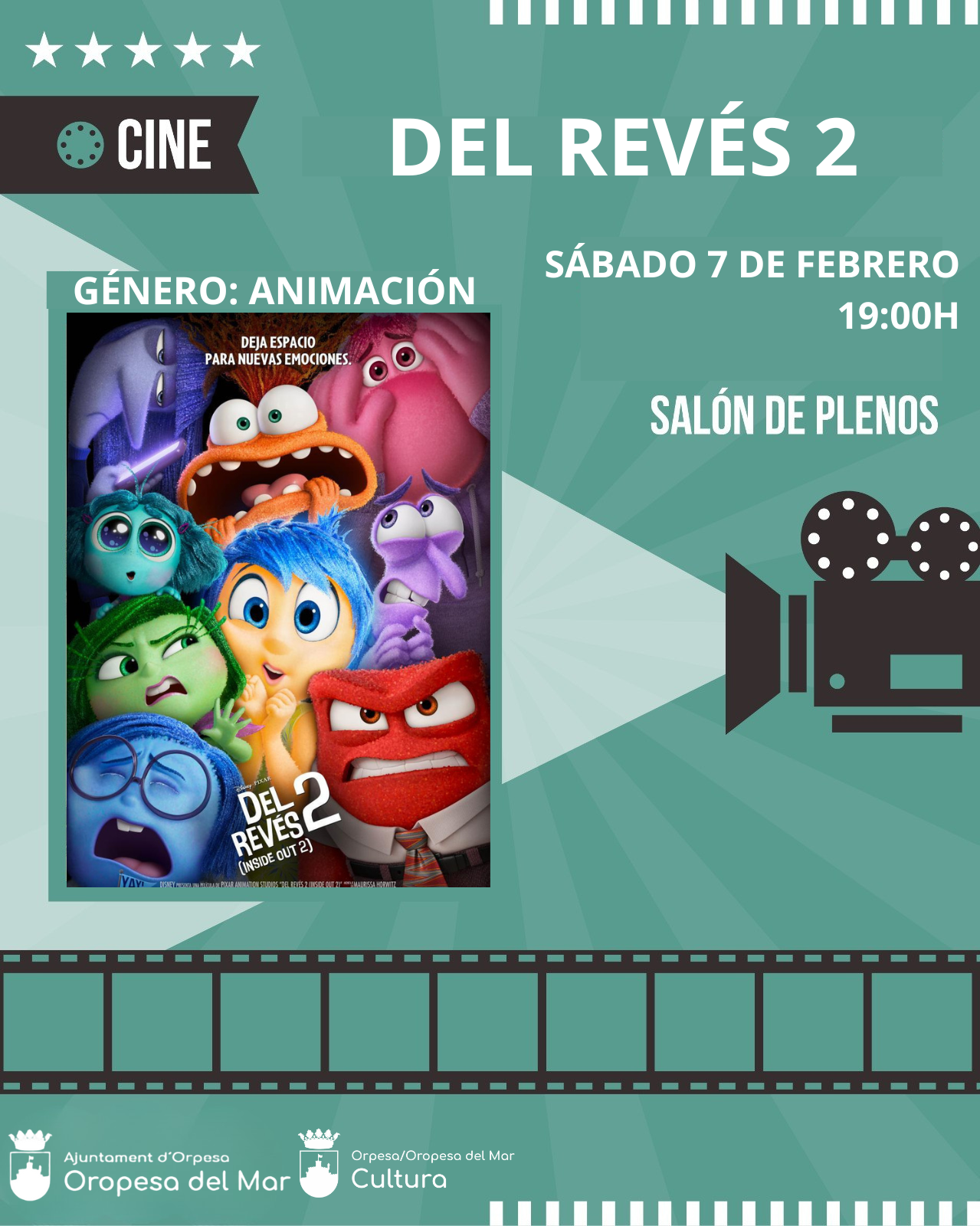 🗣️🏫 El Ayuntamiento de Oropesa del Mar, a través de la concejalía de Cultura, informa que este Sábado 7 de Febrero podremos disfrutar de la sesión de cine semanal con la divertida y didáctica película familiar "Del Revés 2".