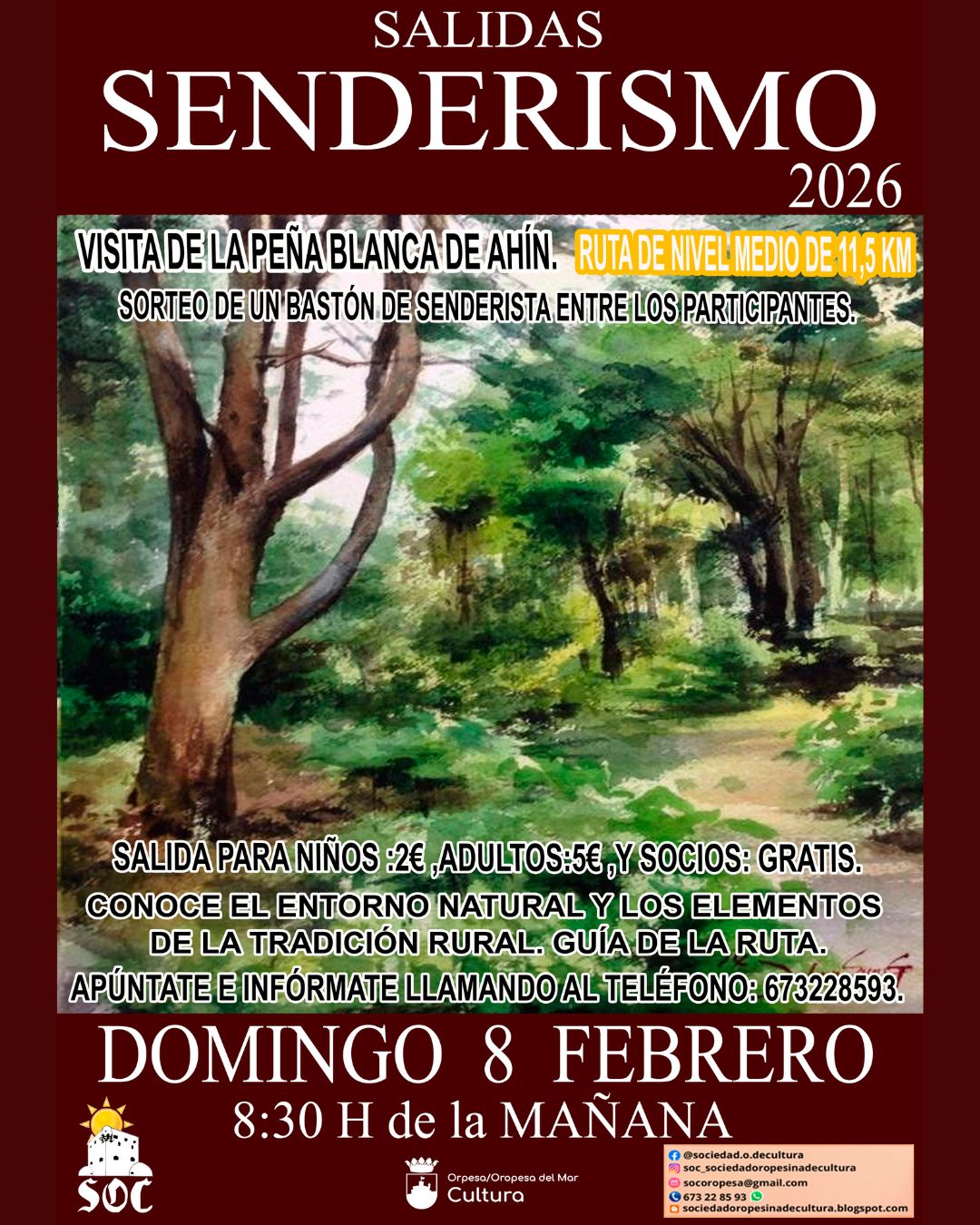 🗣️🏫 El Ayuntamiento de Oropesa del Mar, a través de la concejalía de Cultura en colaboración con la SOC, informa que este domingo 8 de febrero tendrá lugar la salida de senderismo de nivel medio de 11,5km.